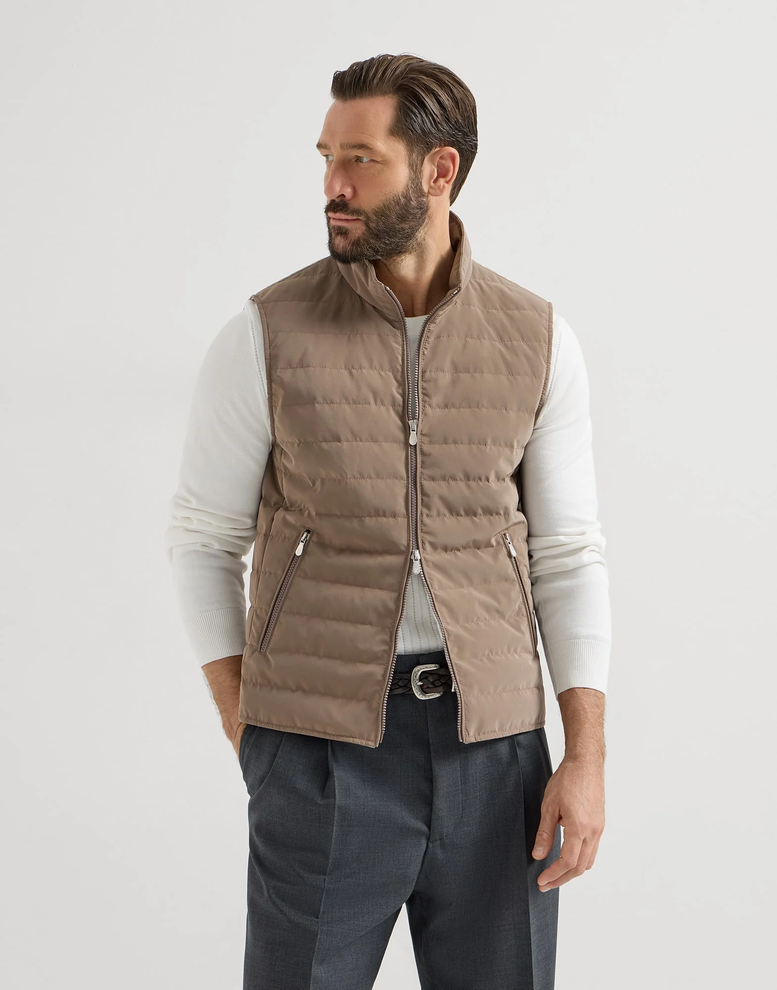 A casual and versatile menswear outerwear icon that is perfect for the changing of seasons, this down vest is enriched with bonded nylon with classic horizontal quilting. The techno fabric’s smooth, fluid texture enhances the season's understated colors with a matte finish, while light padding defines a straight fit with regular volume. MATERIALS Nylon is a lightweight fabric equipped with a thin synthetic inner membrane that provides weather-resistance without compromising breathability. DETAILS Two-way zip closure Stand-up collar Hand pockets with zipper Water-resistant nylon lining Two interior pockets with button closure and pen holder All padding is certified according to the RDS (Responsible Down Standard) 70% POLYESTER, 30% NYLON