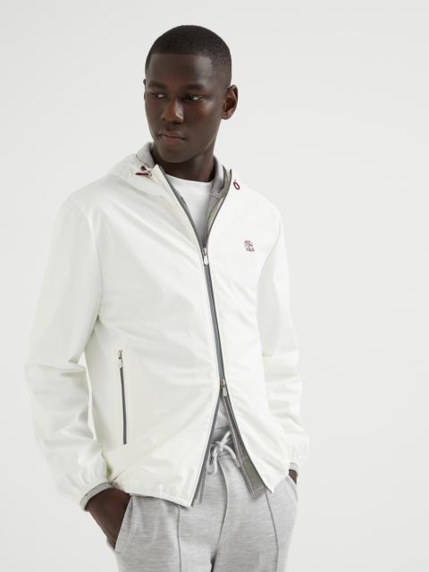 The ultra-lightweight, comfortable texture of bonded nylon makes this hooded jacket from the Travelwear line, dedicated to relaxation and leisure, versatile and functional. The two-way zipper closure, adjustable hood, and the elasticized cuffs and bottom accentuate the garment’s casual feel. The detail of the Solomeo logo on the chest adds a personalized touch. MATERIALS Nylon is a lightweight fabric equipped with a thin inner membrane that improves weather-resistance without compromising breathability. DETAILS Two-way zip closure Lined hood and adjustable drawstring Hand pockets with zipper Cased elastic cuffs Cased elastic hem Two interior pockets with zip closure Water-resistant nylon lining 83% NYLON, 17% ELASTANE