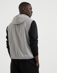 A sporty style and refined materials characterize this outerwear vest from the Travelwear line, dedicated to relaxation and leisure. The garment is made of bonded nylon, a lightweight material with a technical feel that highlights the season’s colors with a rich, matte effect. The hood and zipper closure complete the design with practical details, while the Solomeo logo on the chest adds a personalized note. MATERIALS Nylon is a lightweight fabric equipped with a thin inner membrane that improves weather-resistance without compromising breathability. DETAILS Two-way zip closure Lined hood and adjustable drawstring Hand pockets with zipper Two interior pockets with zip closure Water-resistant nylon lining 83% NYLON, 17% ELASTANE