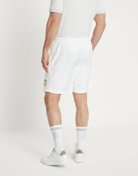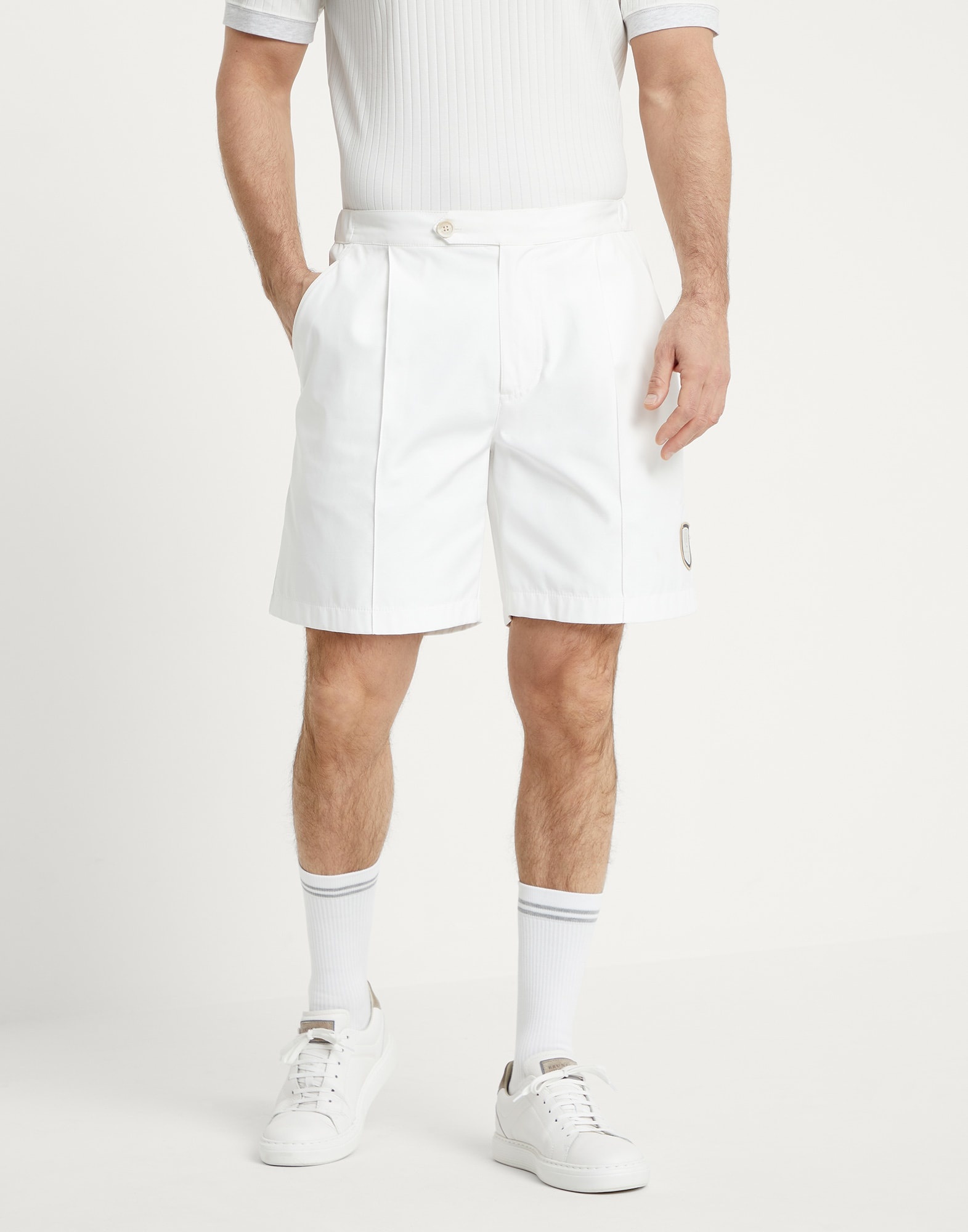 The sporty yet elegant feel of the world of Tennis inspires a selection of creations that enrich the Spring-Summer collection. Tailored style and casual details come together in these bonded nylon Bermuda shorts for a sophisticated mix of inspiration. The informal fabric is paired with the elements of the tabbed waistband and pleats to give the garment a sartorial and contemporary allure at the same time. The Tennis badge completes the design with a refined touch. MATERIALS The new nylon fabric features the classic smooth, fluid texture with a sporty feel. An additional layer of soft jersey on the inside provides a soft, comfortable sensation against the skin. DETAILS Zip closure with button and backing button Vertical front pockets Pleat Back welt pockets 93% COTTON, 7% POLYESTER