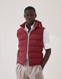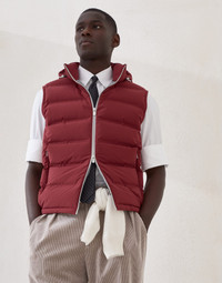 The quality of the materials and skillful techniques enhance the sporty feel of this down vest with detachable hood. The typical texture of taffeta, smooth and matte-looking, highlights the season’s nuances and enriches this quilted outerwear piece with heat-sealed profiles reminiscent of technical activewear, for a contemporary style. The inner membrane and light padding ensure comfort and protection. MATERIALS Nylon taffeta offers a lightweight, fluid and compact texture with a smooth, semi-matte appearance. The percentage of elastane in the fabric provides added comfort, while the addition of a thin bonded layer enhances protection from the elements without compromising breathability. All of the goose down fill comes exclusively from European suppliers who are members of the EDFA (European Down and Feather Association), which guarantees animal and environmental welfare. DETAILS Two-way zip closure Stand-up collar Detachable hood Hand pockets with zipper Synthetic fabric lining Two interior pockets with button closure and pen holder High quality goose down fill 87% NYLON, 13% ELASTANE