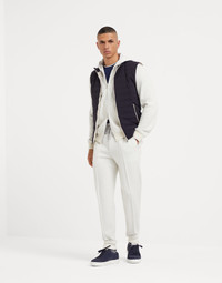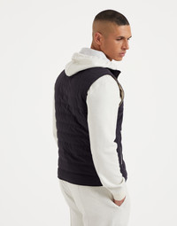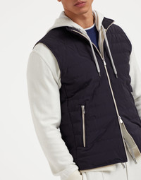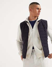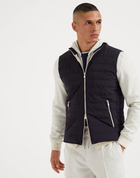 The quality of the materials and skillful techniques enhance the sporty feel of this lightweight zipper down vest. The typical texture of taffeta, smooth and matte-looking, highlights the season's nuances and enriches this quilted outerwear piece, complemented by an inner membrane and a light padding for extra protection. The fit offers straight and regular proportions. MATERIALS Nylon taffeta offers a lightweight, fluid and compact texture with a smooth, semi-matte appearance. The percentage of elastane in the fabric provides added comfort, while the addition of a thin bonded layer enhances protection from the elements without compromising breathability. All of the goose down fill comes exclusively from European suppliers who are members of the EDFA (European Down and Feather Association), which guarantees animal and environmental welfare. DETAILS Two-way zip closure Stand-up collar Hand pockets with zipper Water-resistant nylon lining Internal pocket with zip closure High quality goose down fill 87% NYLON, 13% ELASTANE