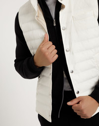 The quality of the materials and skillful techniques enhance the sporty feel of this lightweight down vest. The typical texture of taffeta, smooth and matte-looking, highlights the season's nuances and enriches this quilted outerwear piece, complemented by an inner membrane and a light padding for extra protection. The fit offers straight and regular proportions. MATERIALS Nylon taffeta offers a lightweight, fluid and compact texture with a smooth, semi-matte appearance. The percentage of elastane in the fabric provides added comfort, while the addition of a thin bonded layer enhances protection from the elements without compromising breathability. All of the goose down fill comes exclusively from European suppliers who are members of the EDFA (European Down and Feather Association), which guarantees animal and environmental welfare. DETAILS Snap closure Stand-up collar Chest pocket Hand pockets with snap Water-resistant nylon lining Internal pocket with zip closure High quality goose down fill 87% NYLON, 13% ELASTANE