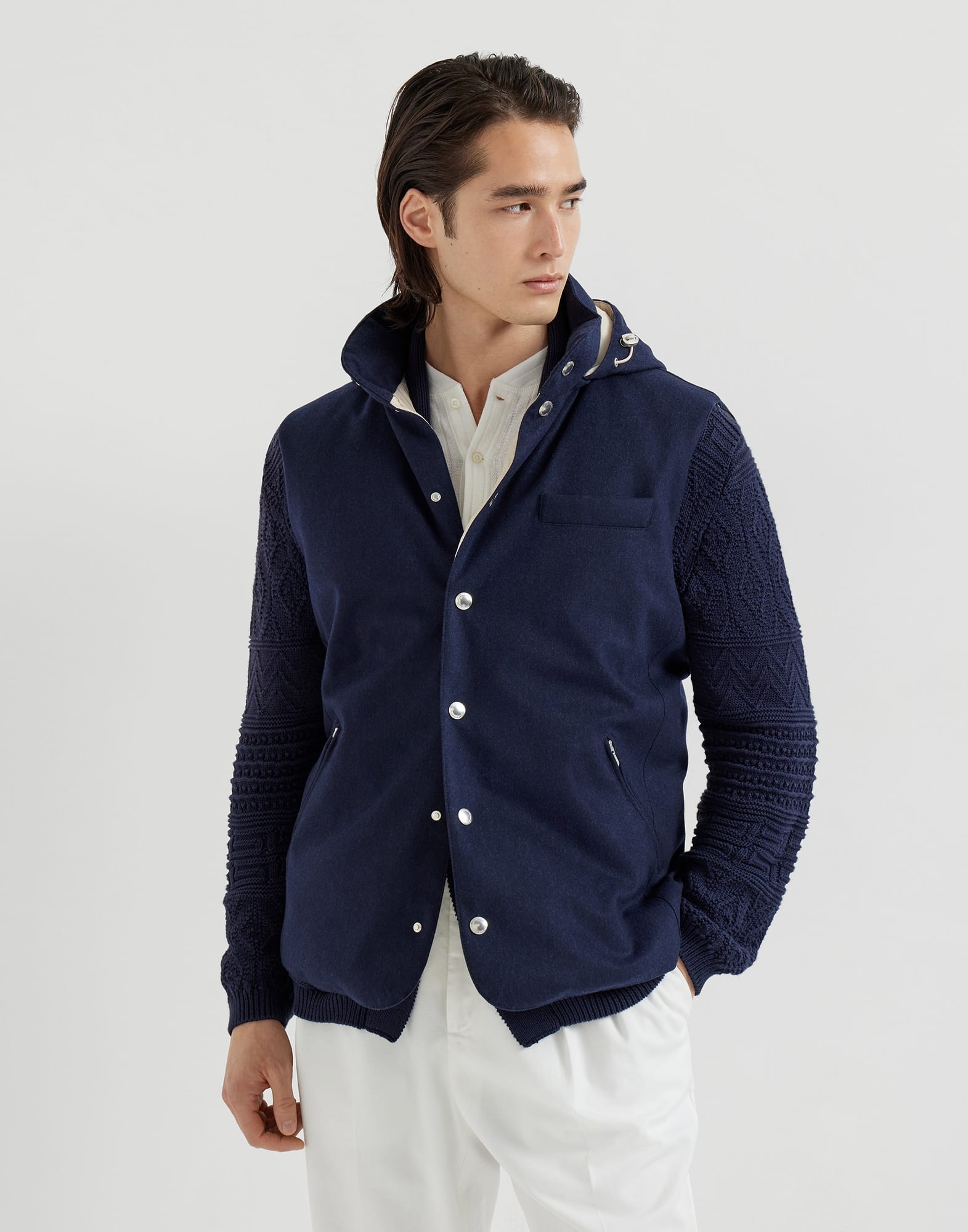 The Brunello Cucinelli fine materials elevate the classic sleeveless down jacket. The laminated wool beaver, with its compact texture and pleasant feel, combines casual charm with excellent performance thanks to its protective membrane and high-quality padding, ideal for facing the cold season. The detachable hood adds a functional touch and completes the design with practicality. MATERIALS The wool beaver is an exceptionally warm and soft fabric, ideal for optimal protection during the coldest periods of the season. The texture recalls the extremely soft feel of animal fleece, from which it derives its characteristic name. The nylon lining is paired with padding sourced exclusively from European suppliers who are members of the EDFA (European Down and Feather Association), ensuring the well-being of animals and the environment. DETAILS Snap closure Water-resistant nylon lining Two interior pockets with button closure Hand pockets with zipper Detachable hood 100% WOOL