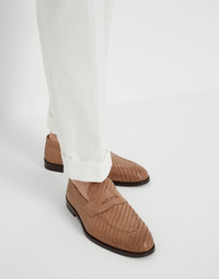 The excellence of Brunello Cucinelli materials reinterprets the casual style of these woven calfskin Penny Loafers in an elegant way. The refined leather is crafted in a particular rich and detailed woven pattern, covering the entire upper with a sophisticated texture. The footwear’s tapered shape is completed with a very thin leather outsole and a lightweight rubber tread. MATERIALS The luxurious calfskin showcases a polished appearance and is characterized by a smooth, even texture. The leather sole with rubber tread and the leather lining provide the footwear with added comfort. DETAILS Leather lining REAL LEATHER