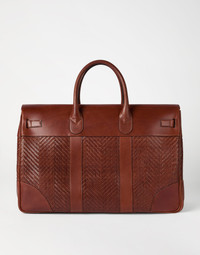A skillful combination of different inspiration and influences, this country bag marries the function of a classic duffel bag with a retro-style construction and refined materials and finishes. The polished, compact finish of braided calfskin stands out next to the natural, matte grain of cowhide, creating a delicate balance of contrasts. Equipped with a practical double handle, the accessory is completed on the inside with an open compartment and a zipper pocket. MATERIALS The special braided workmanship enhances the calfskin leather’s compact, smooth and semi-polished effect, while the cowhide elevates the accessory’s elegant style thanks to its grainy surface and matte finish. A water-resistant fabric lining protects the contents from possible contact with water. DETAILS Flap closure with adjustable strap Double handle Water-resistant fabric lining Internal pocket with zip closure Internal document pocket Removable name tag All metal parts are Nickel-free Accessory is approx. 53 cm (20.87") long, 34 cm (13.39") high and 20 cm (7.87") wide REAL LEATHER