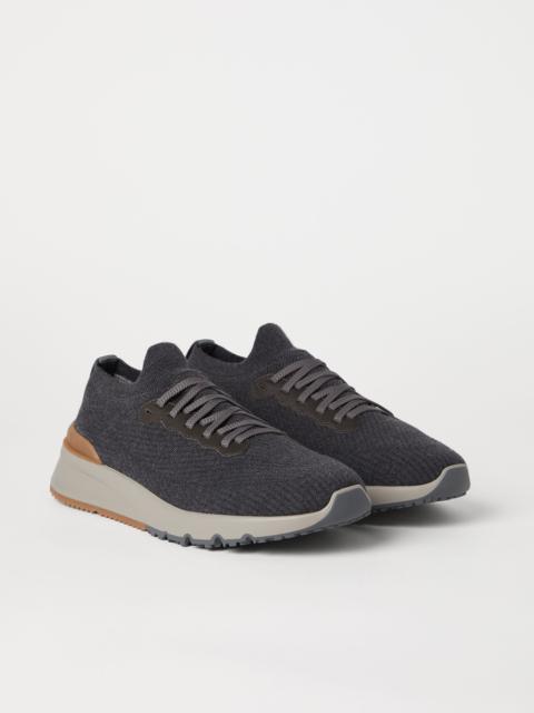 Inspired by the refined yarns of Brunello Cucinelli knitwear, these wool knit new sneakers update the flavor of classic athletic styles in an elegant, modern way. The soft yarn is crafted with a jacquard technique to create a rib knit effect, while the semi-polished calfskin accents add a sophisticated texture contrast. A finish enriches the yarn with water-repellent properties and a warm virgin wool lining makes this footwear ideal for the colder months. MATERIALS The wool knit offers a fine, lightweight and comfortable texture. A warm virgin wool lining and an expanded rubber bottom complete the fit with added comfort. DETAILS Flat fabric laces Wool lining Sole in lightweight micro rubber Detachable insole 100% WOOL