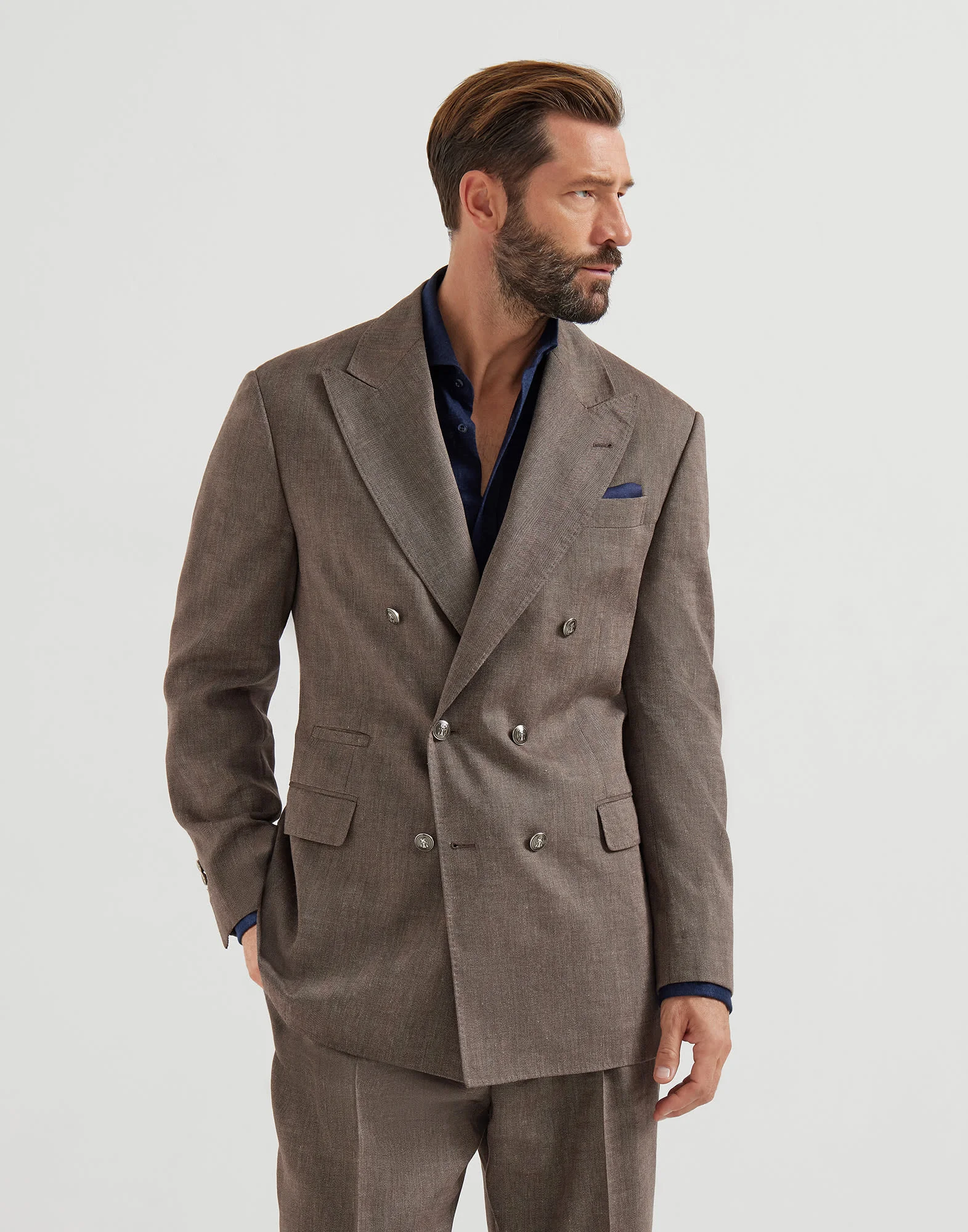 Enriched by the excellence of Brunello Cucinelli yarns, this Tailor blazer creates a balanced mix of contrasting textures and inspiration. The one-and-a-half-breasted silhouette with metal buttons is brought to life by the chevron weave of the linen and virgin wool fabric, which is both lightweight and comfortable. Clean, bold lines define the new fit, which is inspired by the classic codes of tailoring with a structured shoulder, wide lapels and generous volume. The constructed silhouette falls slightly longer at the hip and enhances the male physique with a soft, fluid touch. MATERIALS The mix of natural fibers increases the garment’s comfort and performance. The linen content enriches the chevron’s zig-zag pattern, while the virgin wool accentuates the fabric’s softness and wrinkle-free properties. The cupro half-lining completes the garment. DETAILS 6 metal button closure Peak lapel Cuffs have four metal buttons and functional buttonholes Welt pockets with flap, ticket pocket and chest pocket Cupro half lining Two interior pockets with button closure and pen holder Double back vent Drop 7 60% LINEN, 40% VIRGIN WOOL