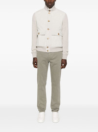 high-neck jacket Highlights - Light grey - Front button fastening - Two front flap pockets - Ribbed trim Made in Italy Composition Outer: Suede 100%, Cashmere 100% Lining: Cupro 100%, Cotton 100% SIZE & FIT Model measurements Height 6 ft 0 in(1.84 m) Bust/Chest 35.82 in(91 cm) Hips 37 in(94 cm) Waist 28.34 in(72 cm) FittingInformation Designed for a regular fit, allowing for a comfortably loose fit throughout the body The ribbed hem offers a close, comfortable fit Made from a midweight fabric Washing instructions Specialist Cleaning