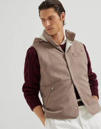 The casual style of this down vest is enriched with high-quality yarns and skillful techniques. The lightweight and compact texture of bonded wool flannel, a fabric with a classic sartorial feel, is updated thanks to the sporty and comfortable design of the garment, while the detachable hood adds versatility. The fit is both regular and comfortable. MATERIALS Wool flannel is a classic lightweight, compact fabric that perfectly conveys the qualities of the refined natural fiber. The addition of a thin bonded layer enhances protection from the elements without compromising breathability, while the high-quality goose down and feather padding completes the garment. All of the filling is acquired exclusively from European suppliers who are members of the EDFA (European Down and Feather Association), guaranteeing animal and environmental welfare. DETAILS Snap closure Stand-up collar Detachable drawcord hood with lining Chest pocket Hand pockets with zipper Lined Two interior pockets with button and pen holder High quality goose down fill 100% WOOL