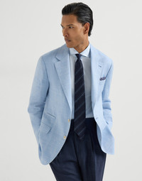 Enriched by the excellence of Brunello Cucinelli yarns, this deconstructed blazer creates a balanced mix of contrasting textures and inspiration. The classic silhouette with lapels and flap pockets is brought to life by the chevron weave of the linen and virgin wool fabric, which is both lightweight and comfortable. The “Solomeo Shoulder”, named after the hamlet where the company is located, characterizes the Brunello Cucinelli blazer with signature proportions. The tapered and pronounced cut of the shoulder enhances the male physique without the need for padding. MATERIALS The mix of natural fibers increases the garment’s comfort and performance. The linen content enriches the chevron’s zig-zag pattern, while the virgin wool accentuates the fabric’s softness and wrinkle-free properties. The cupro lining completes the garment. DETAILS 3-roll-2 closure with horn buttons Notched lapel Cuffs have four horn buttons and functional buttonholes Welt pockets with flap, ticket pocket and chest pocket Cupro half lining Two interior pockets with button closure and pen holder Double back vent Drop 7 60% LINEN, 40% VIRGIN WOOL