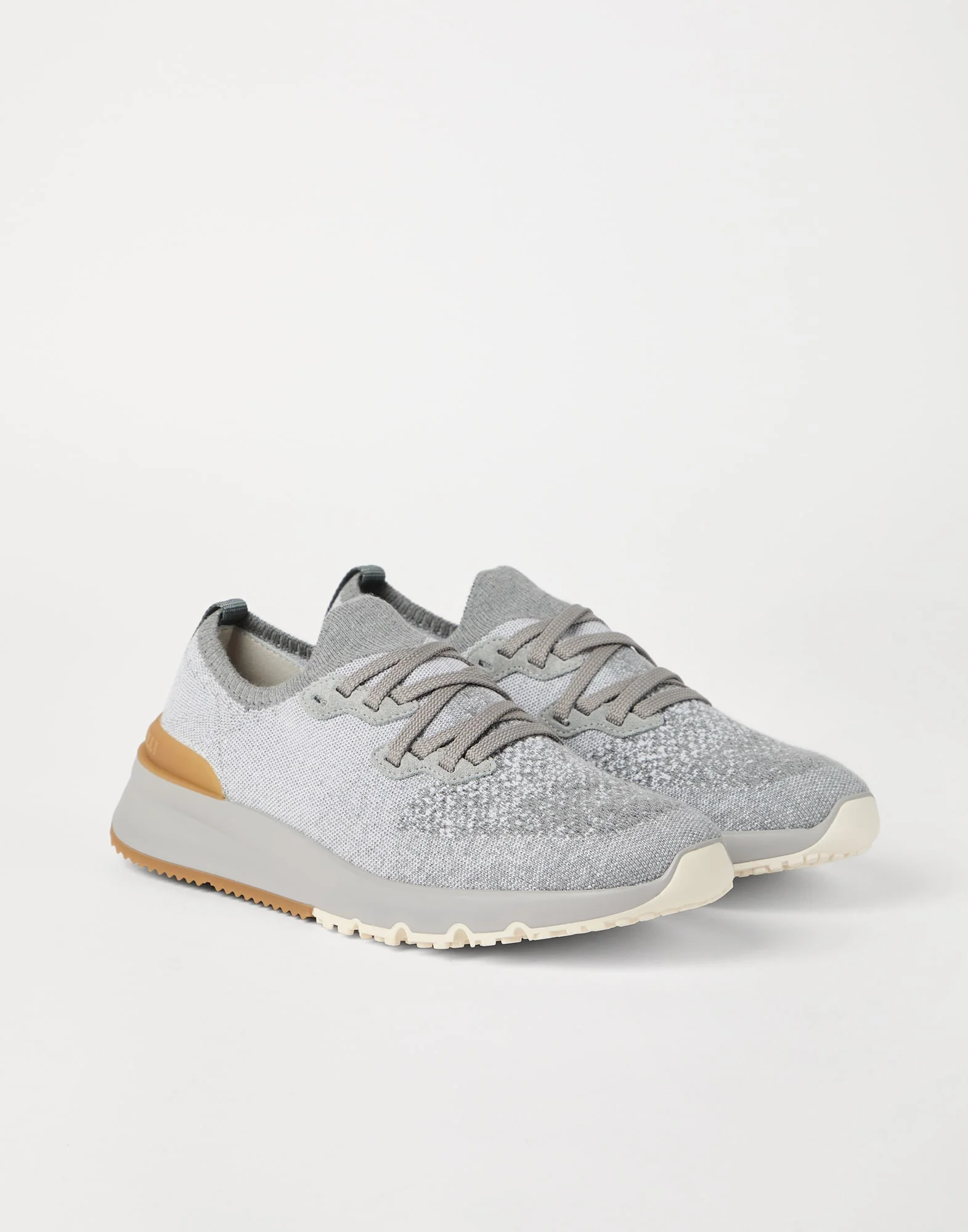 The classic yarns of Brunello Cucinelli knitwear inspire the elegant, sporty feel of these sneakers. The upper is made of a very lightweight, stretch chine knit, which showcases a compact appearance on the sides with "micro-perforations" on the toe, a detail characteristic of sporty accessories. The elasticity of the knit guarantees an optimal fit and comfort. MATERIALS The cotton knit combines natural and synthetic fibers as well as a small percentage of spandex to provide optimal comfort. Its unlined construction and EVA bottom offer lightness. DETAILS Flat fabric laces Unlined Sole in lightweight micro rubber Detachable insole 89% COTTON, 10% NYLON, 1% ELASTANE