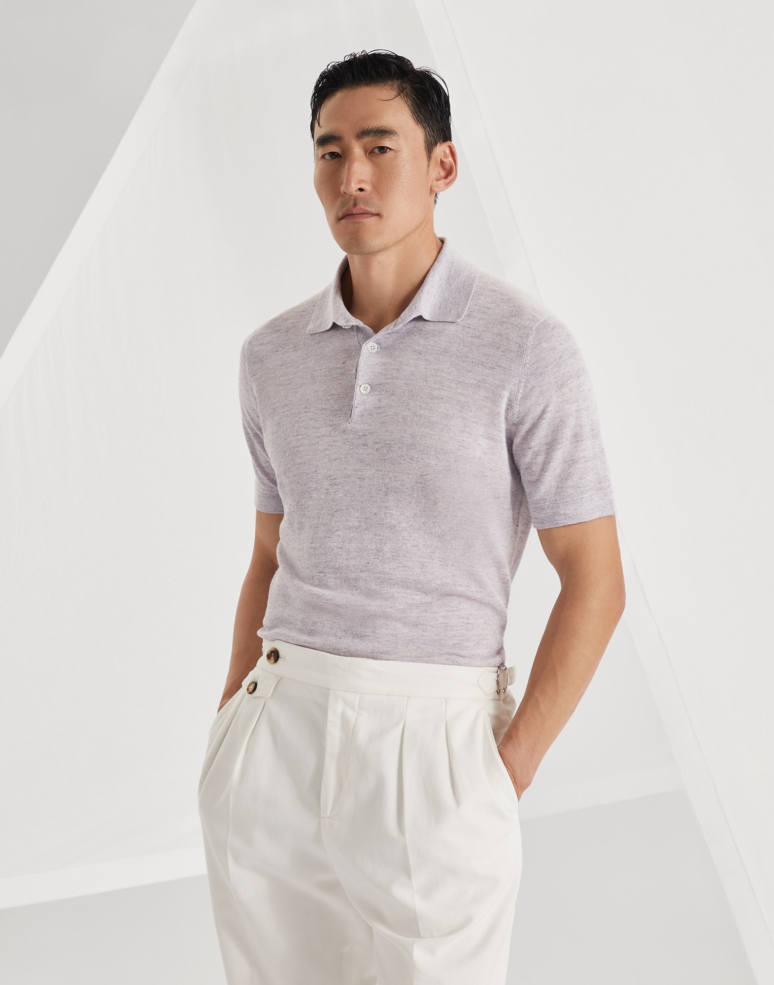 Iconic summer materials enrich the informal style of this polo. Particularly suited for milder weather, the lightweight linen and cotton yarn is cooling to wear and perfectly complements the garment’s casual proportions, characterized by straight, comfortable lines. MATERIALS The combination of natural linen and cotton fibers creates a fine yarn with a slightly irregular thickness. Lightweight and pleasant to wear, the texture is enriched by the slubbed characteristic of the linen, which gives the garment a sophisticated and fresh character. DETAILS Button opening Plain stitch 77% LINEN, 23% COTTON