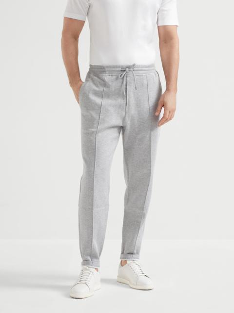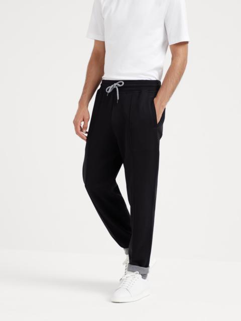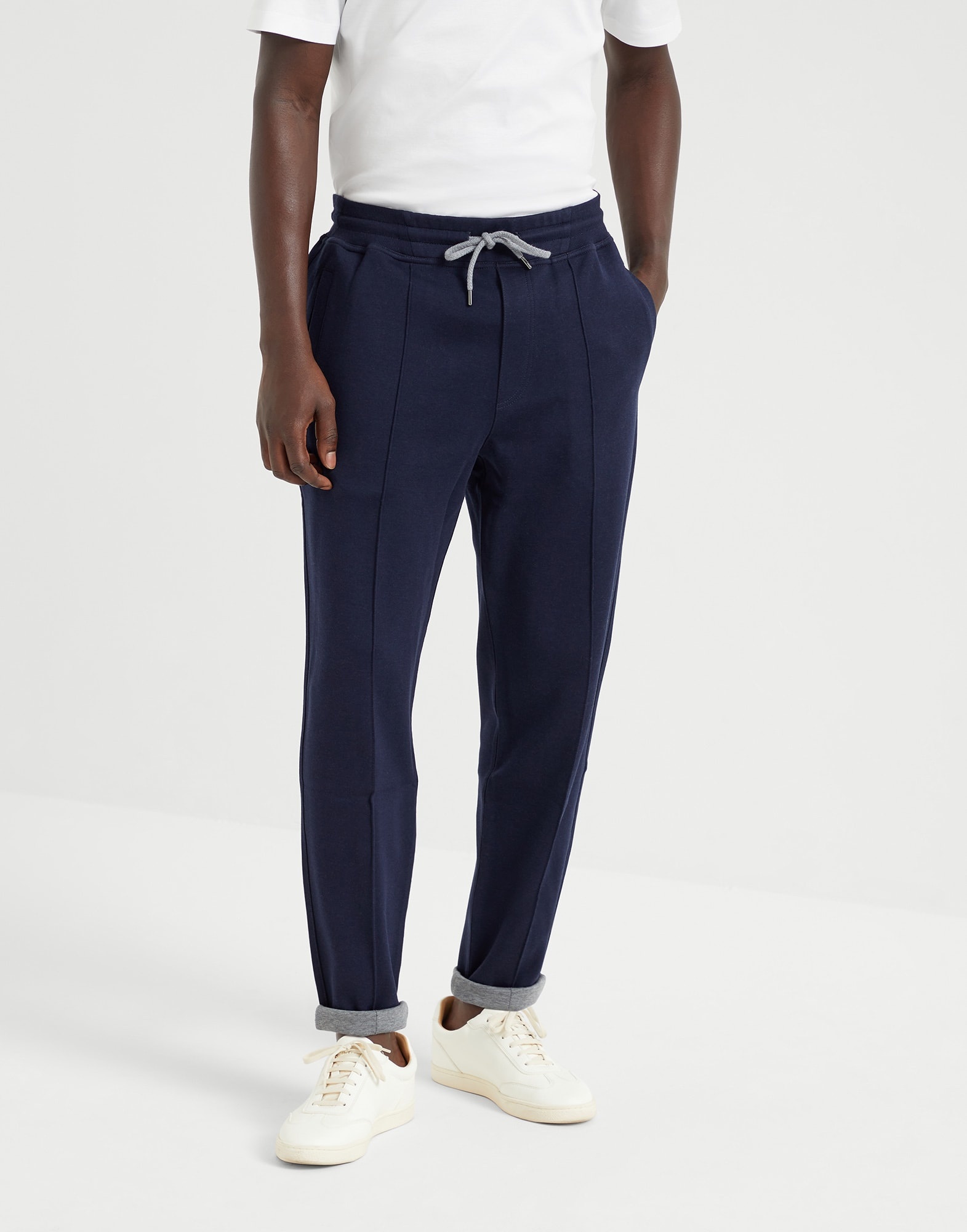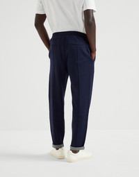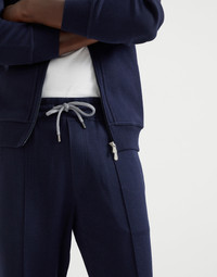 Refined materials enrich the sporty style of the Travelwear line, dedicated to moments of relaxation and free time. The natural fibers of cotton, cashmere and silk, worked in a double fabric, enhance these casual drawstring trousers. The garment is characterized by a “Crete” detail creating a fine permanent crease down the leg, paired with a comfortable fit. MATERIALS Double French terry uses natural cotton, cashmere and silk fibers to provide warmth, softness and protection. The presence of elastic fibers helps to perfect its comfort. DETAILS Rib knit waistband with drawstring Vertical front pockets Crete Rib knit hem with zipper Back welt pocket with button 65% COTTON, 24% NYLON, 7% CASHMERE, 4% SILK
