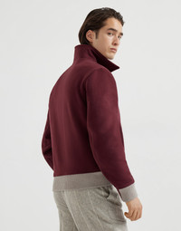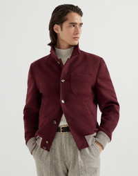 The vintage feel of this shirt-style bomber jacket recalls the silhouette of college varsity jackets, adding a retro allure to this piece. Pure wool flannel enhances the seasonal colors with a slightly irregular texture and lends a warm yet lightweight touch to the garment. The fit is essential and comfortable thanks to the impeccable finishes of the handcrafted double construction and to the elasticated inserts on the bottom band and cuffs. MATERIALS The color’s slightly uneven look is spread across the surface of the flannel, a lightweight and compact fabric that perfectly displays the wool fiber’s superior qualities. The skillful hand-finished effect enhances the qualities of the material. The very lightweight cupro lining provides added comfort. DETAILS Horn button closure Collar may be worn raised Upper patch pocket Hand pockets with snap Rib knit cuffs and bottom band Cupro lining Two interior pockets with button and pen holder 100% WOOL