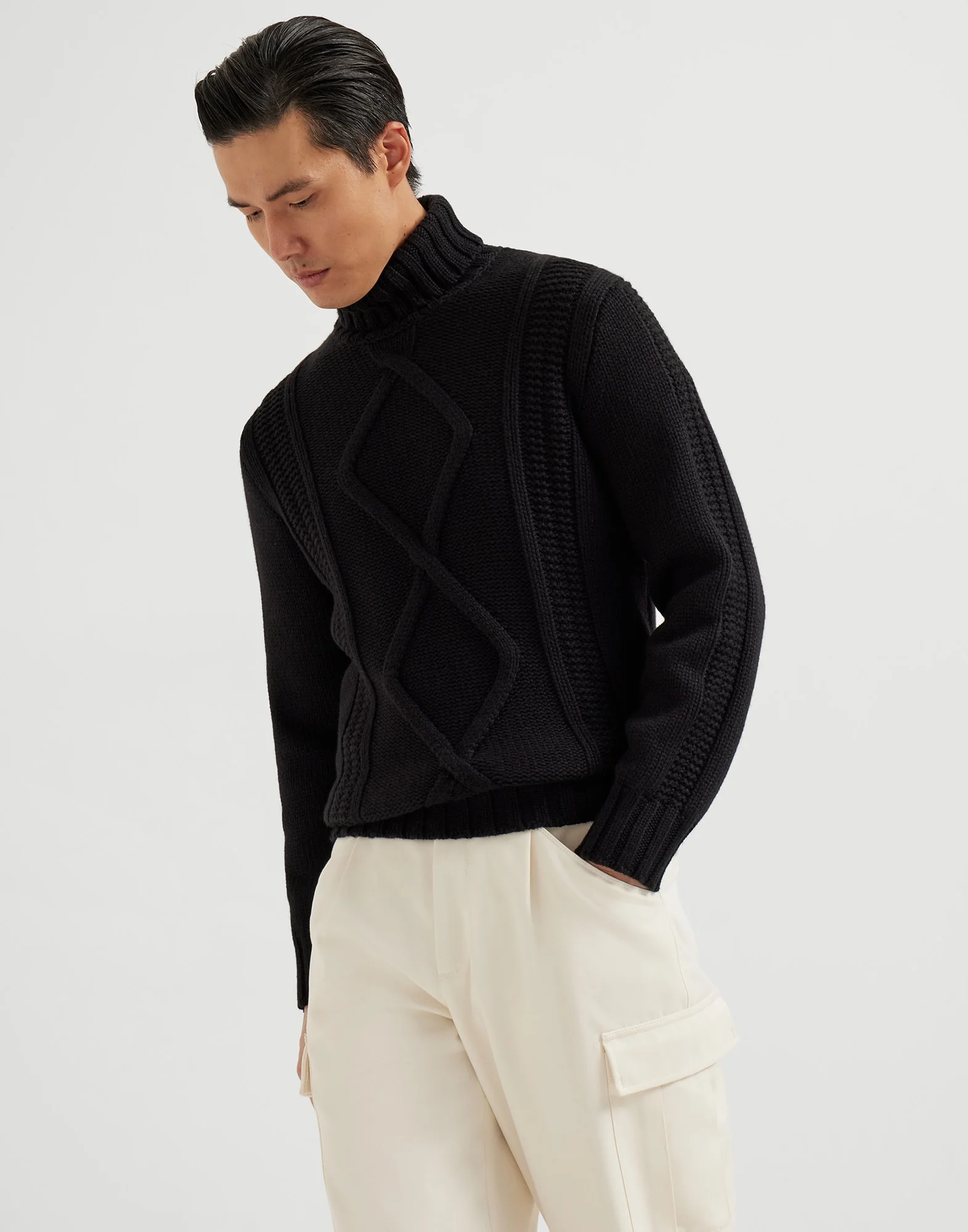 Irish cable turtleneck sweater in cashmere Feather yarn