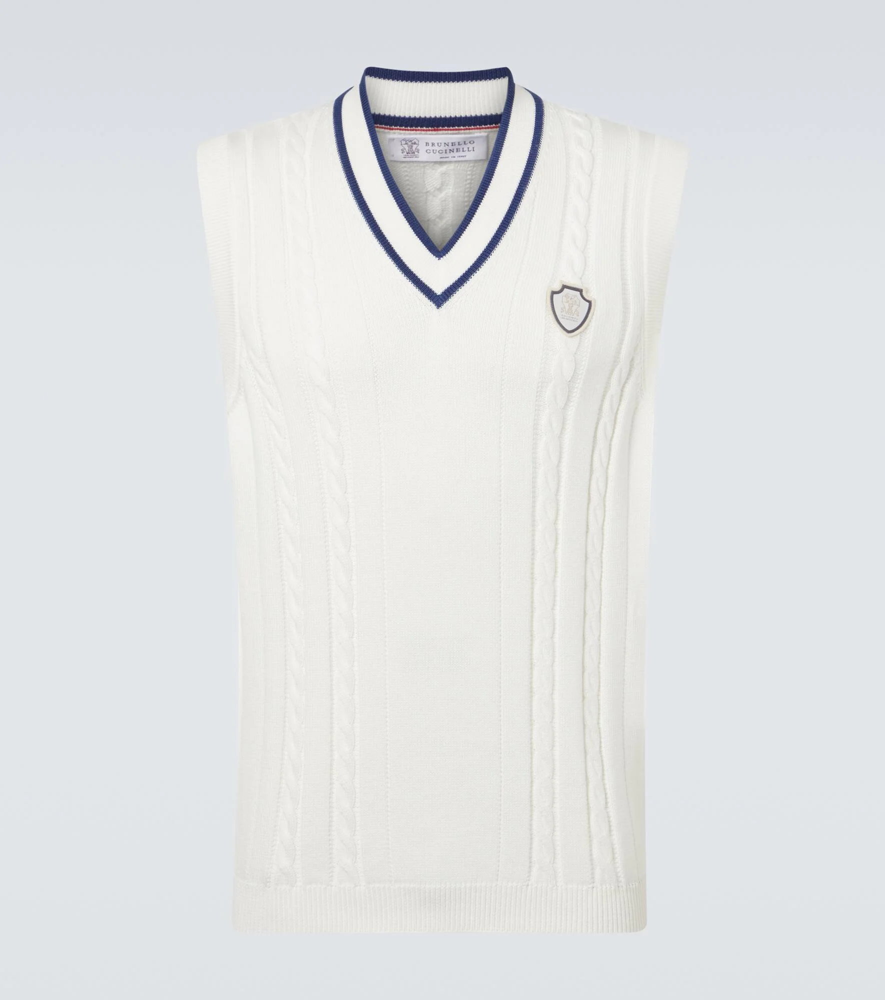 This Brunello Cucinelli sweater vest brings a preppy style to the ensemble. Made from cotton, the design features a ribbed, striped V-neckline and a cable-knit finish with subtle embroidery on the chest. Product Details - Material: 100% cotton - Care instructions: hand wash - Made in Italy - Designer color name: Panama+Avio - Item color: white, blue - Collar: V-neck - Hem: ribbed - Item number: P01138643 Size & Fit - True to size - Straight fit - Stretchy fabric - Falls to the hip - The model in the picture is 185cm-6'1" and wearing a size L