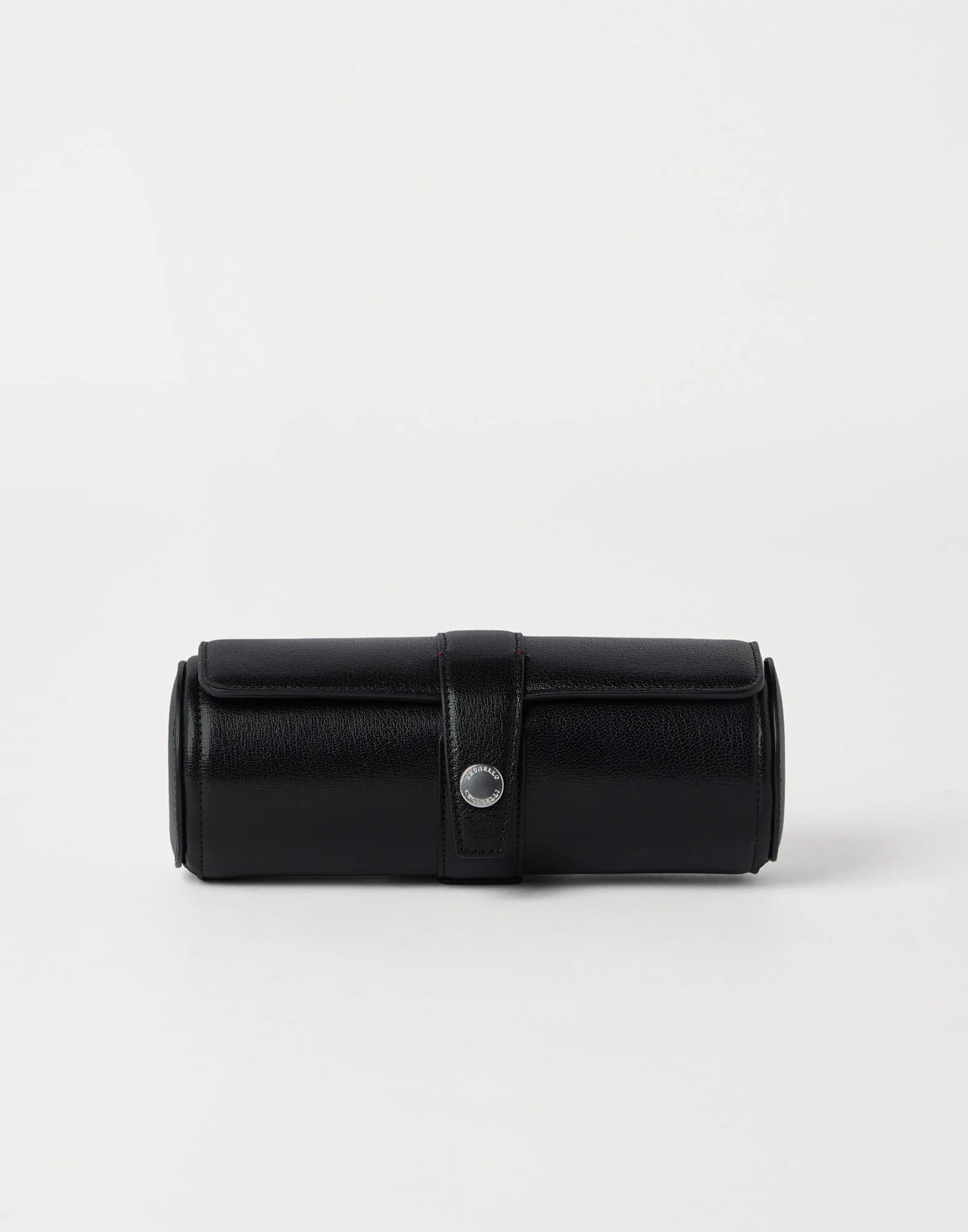 An elegant vision of the male wardrobe takes shape through refined materials and finishes in a selection of leather accessories characterized by essential lines and versatile style, such as this capretta watch box. The grain is fine and delicate, ideal for enhancing the season’s colors, while the leather’s characteristic lightness highlights the artisanal construction of this accessory. The design is completed with functional details such as internal slots and the snap closure. MATERIALS Characterized by a light hand and a particular fine grain, the capretta leather is an elegant leather with a smooth, fluid texture that gives the season’s colors intensity and character. DETAILS Snap closure Suede lining Removable suede-covered cylinder for watches All metal parts are Nickel-free The accessory measures approximately 21 cm (8.27") in length and 8 cm (3.15") in diameter REAL LEATHER
