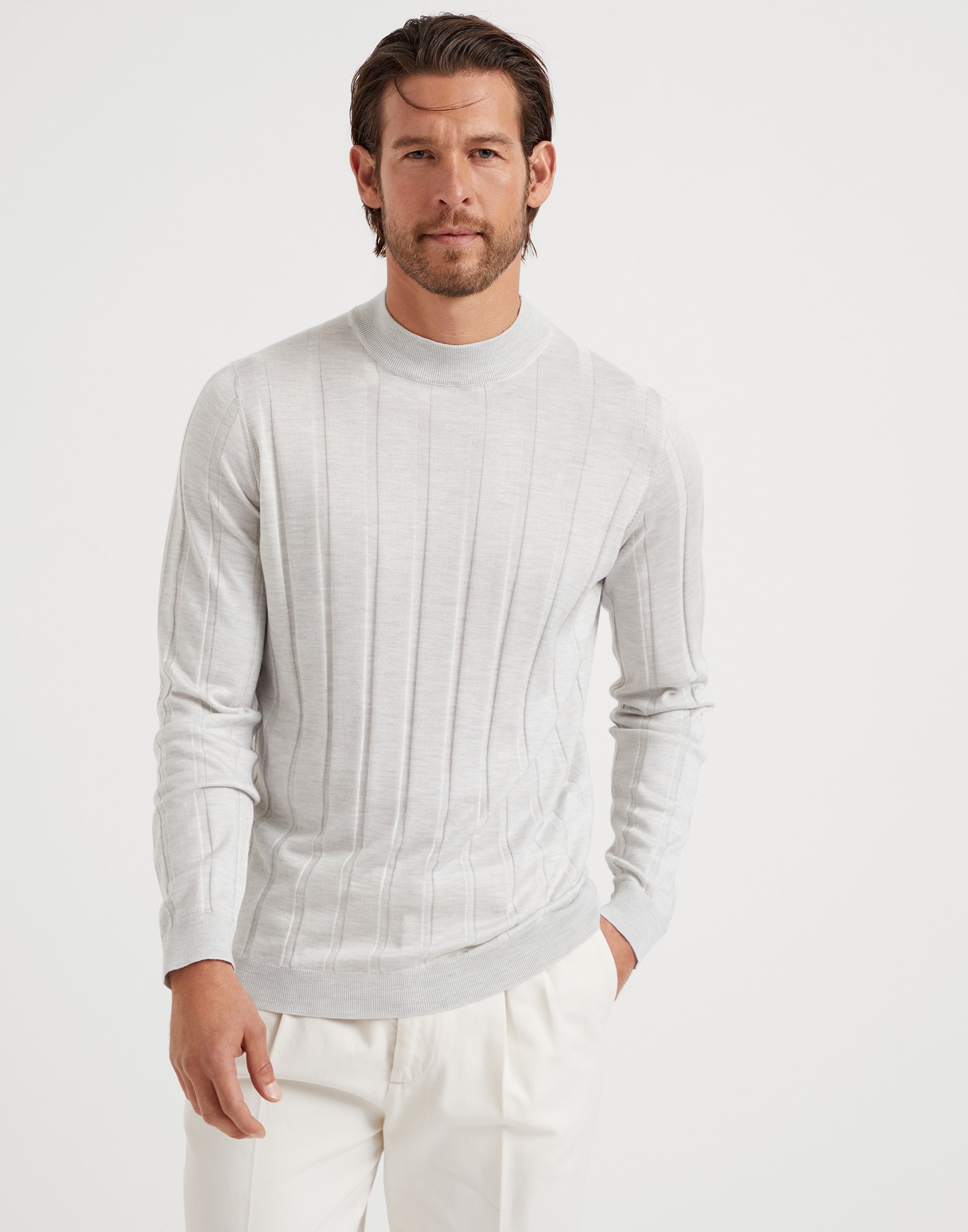 The beauty of Brunello Cucinelli knitwear is conveyed in this cashmere and silk sweater. The blend of the natural yarns gives the garment lightness and a distinct smooth texture, while the flat ribbed knit enhances the garment’s casual feel. The mock neck completes the regular fit. MATERIALS Single-ply manufacturing of the cashmere and silk yarn brings out the qualities of the natural fibers and provides lightness and comfort. The garment takes on a balanced weight which is very pleasant to wear. DETAILS Funnel neck in rib knit Regular shoulder Rib knit 70% CASHMERE, 30% SILK