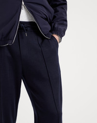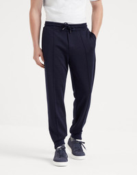 Refined materials enrich the sporty style of the Travelwear line, dedicated to moments of relaxation and free time. The natural fibers of cashmere and silk, worked in a double fabric, enhance these casual drawstring trousers with elasticated zipper cuffs. The garment is characterized by a “Crete” detail creating a fine permanent crease down the leg, paired with a comfortable fit. MATERIALS Double French terry uses natural cashmere and silk fibers to provide warmth, lightness and protection. The presence of synthetic fibers helps to perfect its comfort. DETAILS Rib knit waistband with drawstring Vertical front pockets Crete Bottom with zipper closure Back welt pockets 67% CASHMERE, 29% SILK, 4% NYLON