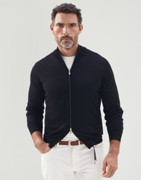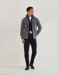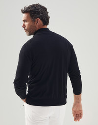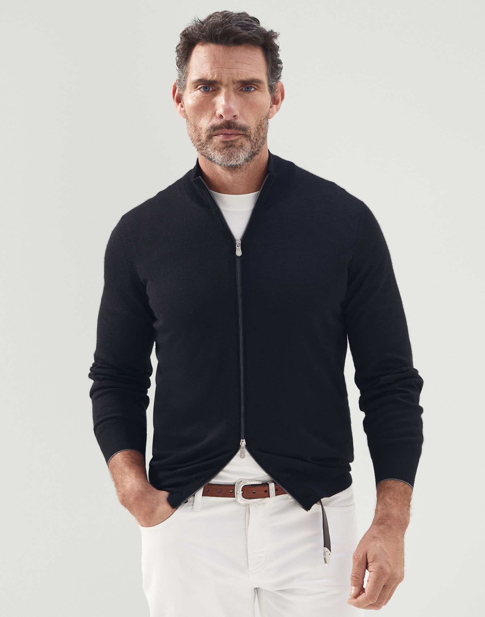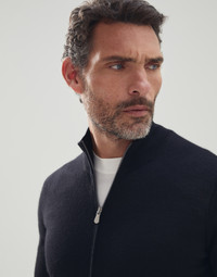 The versatile and timeless feel of this cardigan is paired with the precious qualities of cashmere and silk. The yarn’s plush and ultra lightweight texture showcases the iconic colors of the Menswear collections, which stand out thanks to the contrast color used for the die-cast zippers and the edges of the rib-knit cuffs. Its fit is characterized by its regular, comfortable proportions. MATERIALS Single-ply manufacturing of the cashmere and silk yarn brings out the qualities of the natural fibers and provides lightness and comfort. The garment takes on a balanced weight which is very pleasant to wear. DETAILS Two-way zip closure High collar in rib knit Rib knit cuffs and bottom band Plain stitch 70% CASHMERE, 30% SILK