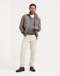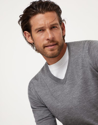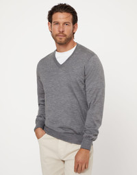 The quality of Brunello Cucinelli materials enhances the lightness of the pullover, an essential men's wardrobe piece. Contrasting color details on the cuffs and collar edges add a sophisticated element to the sweater, which is characterized by a regular, close-fitting shape. MATERIALS Single-ply manufacturing of the cashmere and silk yarn brings out the qualities of the natural fibers and provides lightness and comfort. The garment takes on a balanced weight which is very pleasant to wear. DETAILS Rib knit V-neck Rib knit cuffs and bottom band Plain stitch 70% CASHMERE, 30% SILK