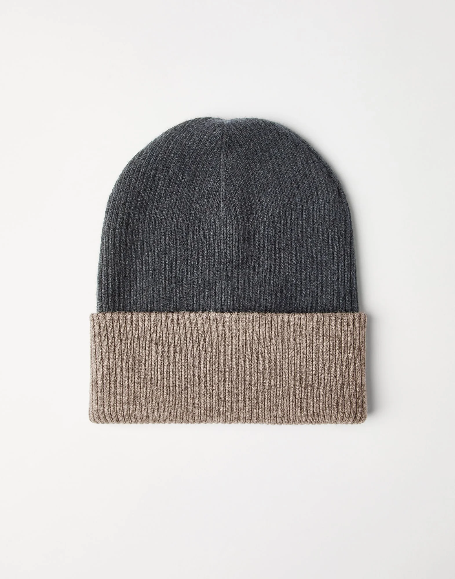 The iconic yarn of the Brunello Cucinelli collections enriches this new beanie, a must-have accessory that provides optimal protection in the winter. A refined cashmere rib knit is detailed in two of the season’s colors to complete an outfit with a touch of color. MATERIALS The noble cashmere fiber is characterized by an extreme fineness and also for its precious insulating qualities which guarantee warmth, providing coverage and lightness when worn. DETAILS Rib knit 100% CASHMERE