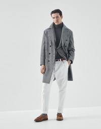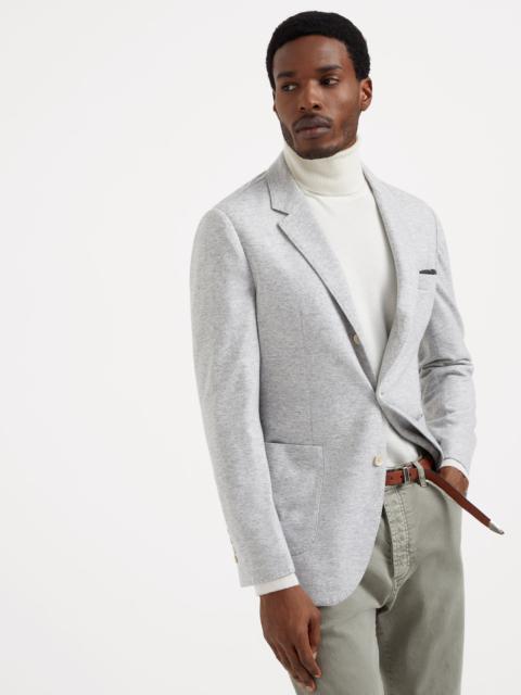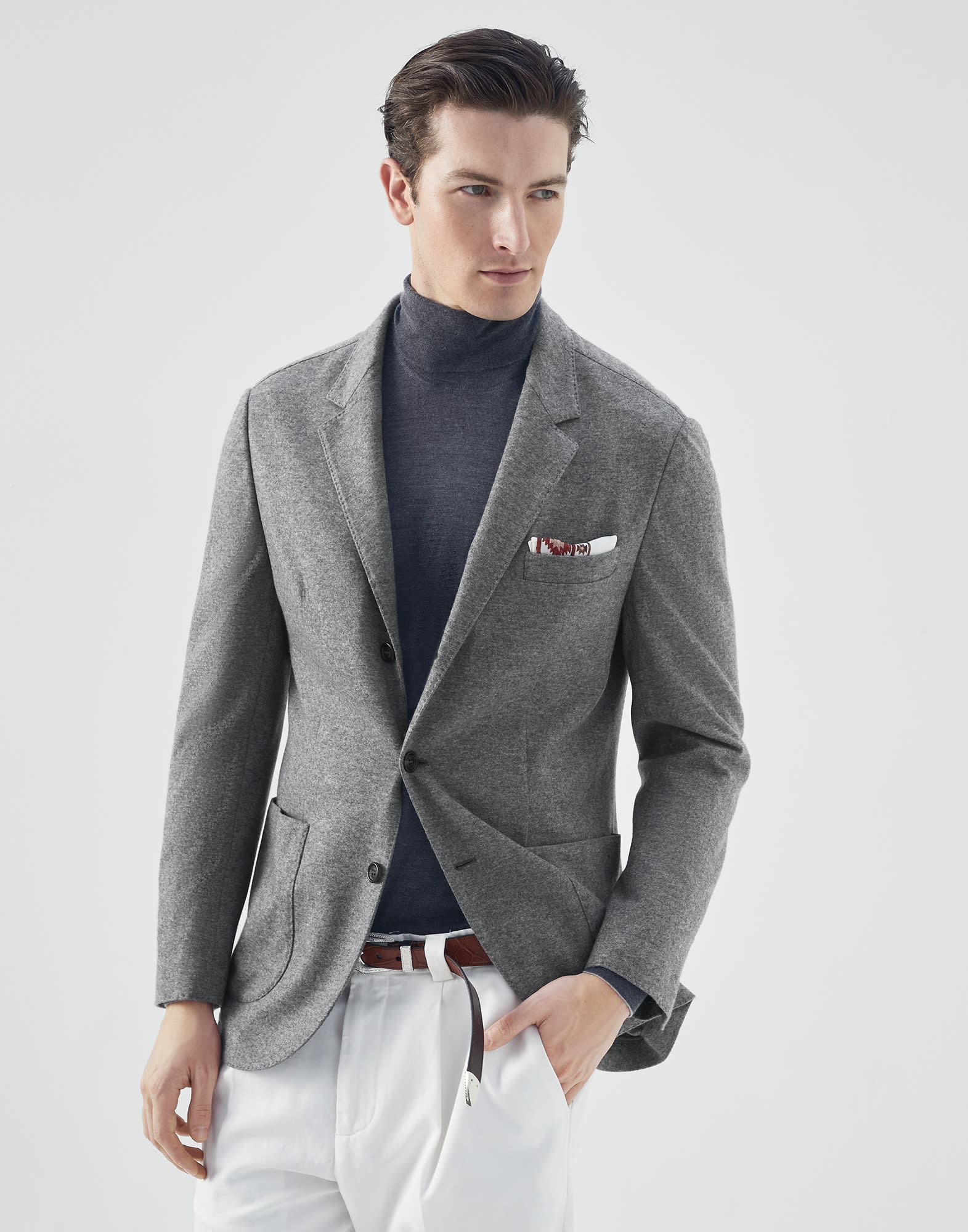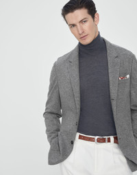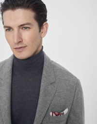 Refined materials and a modern attitude are combined in this new cashmere jersey blazer with patch pockets. Its smooth, soft and comfortable appearance is the result of the natural fibers’ precious qualities. The unlined construction combines lightness and comfort with the classic fit that distinguishes Brunello Cucinelli style: fitted through the chest with slightly pronounced shoulders to highlight the male physique. MATERIALS The cashmere’s refined natural fibers enrich the casual flavor of jersey, a classic T-shirt fabric. DETAILS 3-roll-2 closure with horn buttons Patch pockets and chest pocket Cuffs have four horn buttons and functional buttonholes Two interior pockets with button closure and pen holder Drop 7 Double back vent 100% CASHMERE