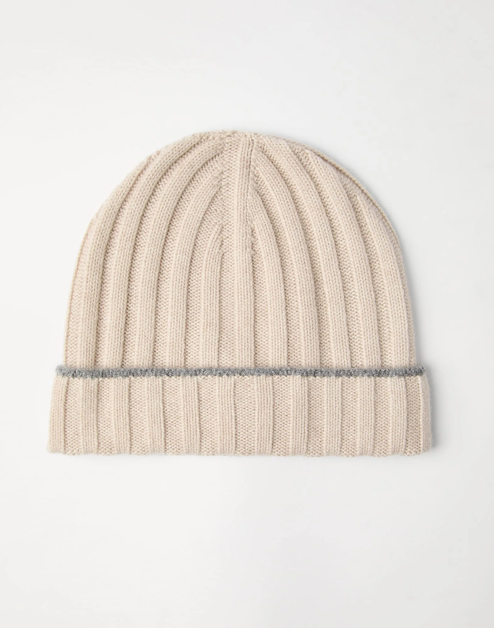 Cashmere, the iconic yarn of the Brunello Cucinelli collections, defines the style of this beanie and guarantees comfort and protection on the coldest days of the season. The classic feel of rib knitting is paired with a contrast color detail along the edge of the accessory. MATERIALS The noble cashmere fiber is characterized by an extreme fineness and also for its precious insulating qualities which guarantee warmth, providing coverage and lightness when worn. DETAILS Rib knit Unlined 100% CASHMERE