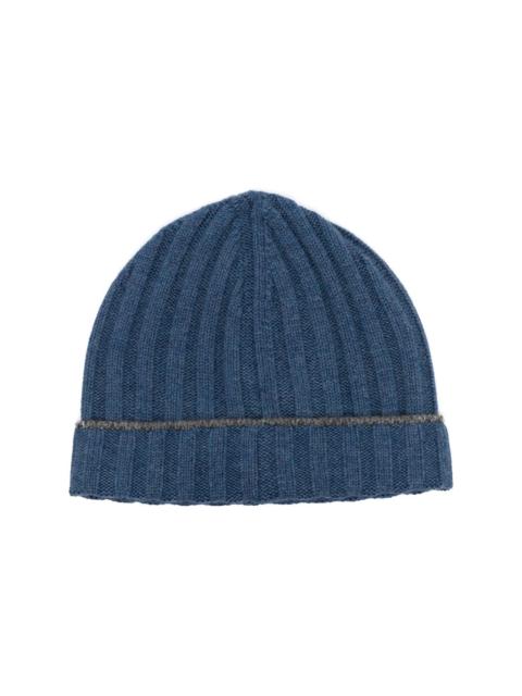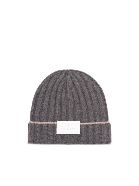 ribbed-knit beanie Highlights - Beige - Folded cuff - Contrasting logo patch - Fine ribbing - Stretch fit Made in Italy Composition Cashmere 100%