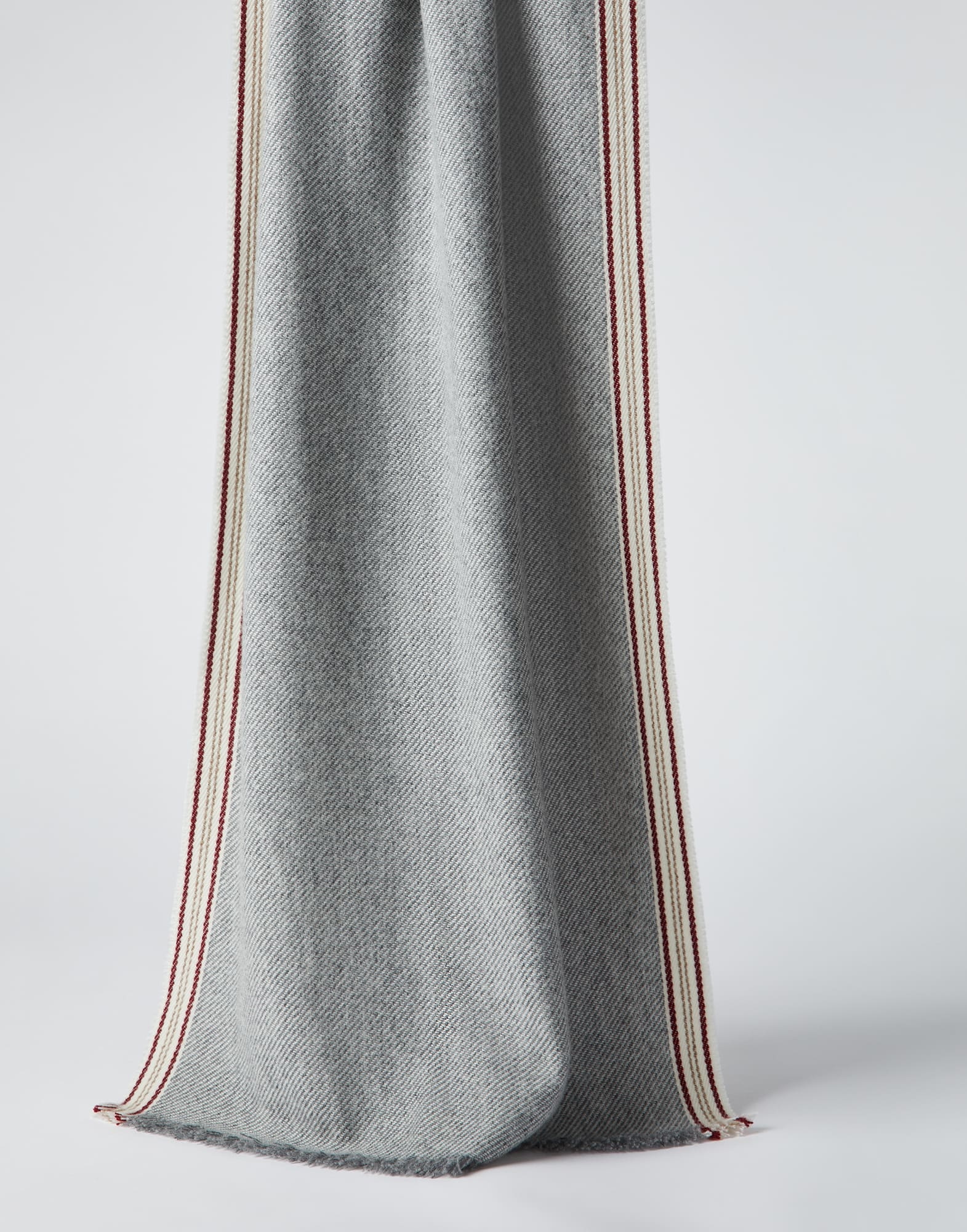 Color details enrich the style of this scarf in cashmere, the iconic refined fiber of the Brunello Cucinelli collections. The contrasting striped design along the long edges brings to mind the selvedge finish of fabrics, completing the accessory with a distinct element. MATERIALS The fine cashmere accessory creates a special soft and cozy feel. DETAILS Scarf measures approx. 46 cm x 160 cm 100% CASHMERE