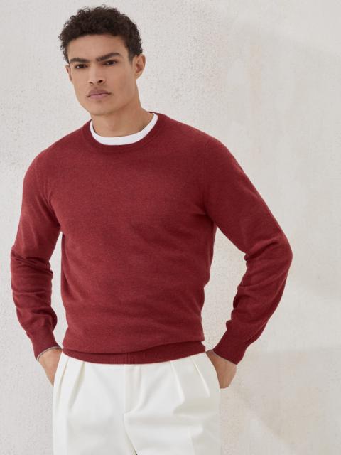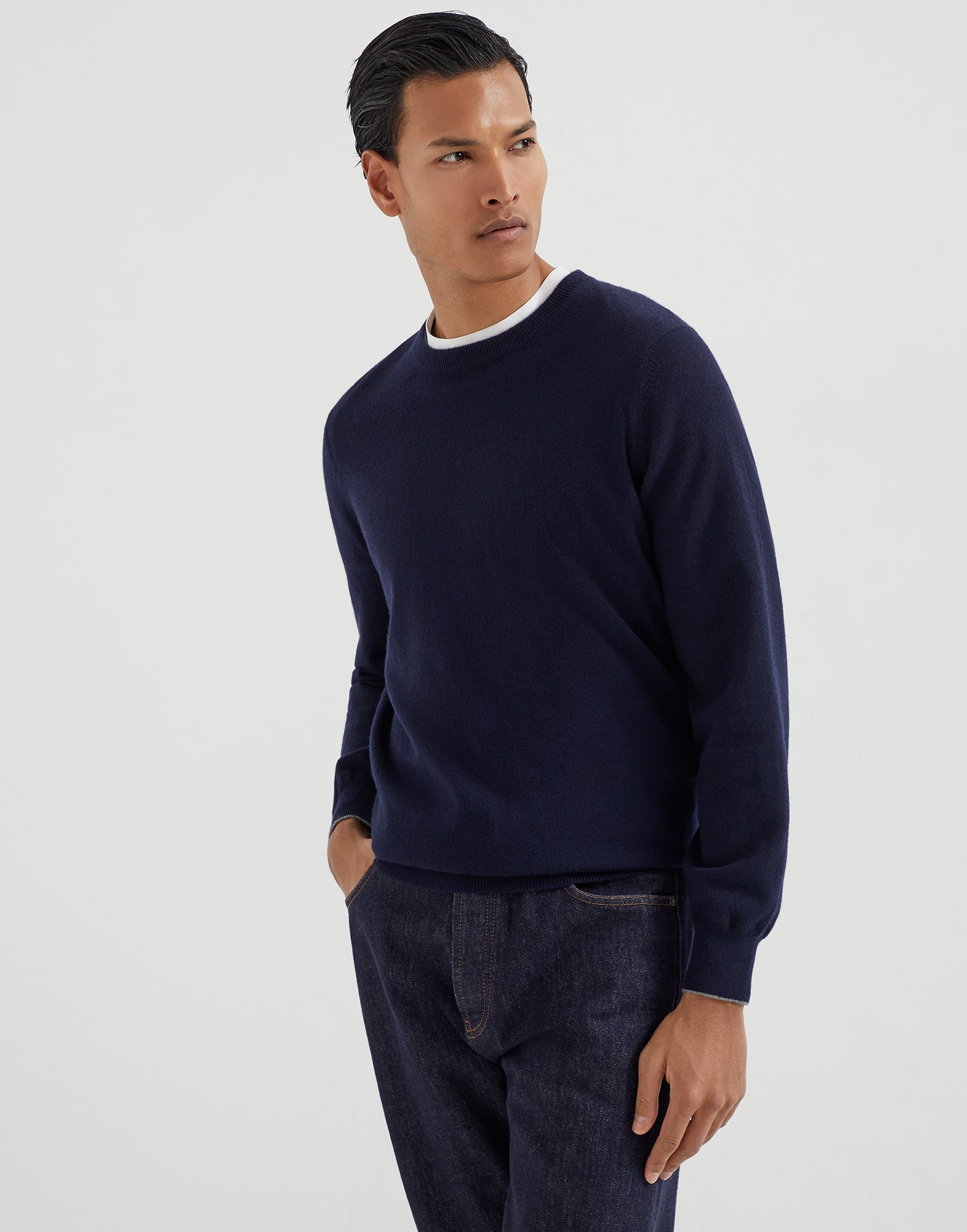 A timeless classic, this pure cashmere sweater represents an icon of the Brunello Cucinelli collections. The natural cashmere fiber’s superior quality enhances its comfortable fit, which is both lightweight and cozy. The contrast color edges of the cuffs and the inside of the crew-neck complete the style of this garment with refined details. MATERIALS The noble cashmere fiber is characterized by an extreme fineness and also for its precious insulating qualities which guarantee warmth, providing coverage and lightness when worn. DETAILS Crew-neck in rib knit Rib knit cuffs and bottom band Plain stitch 100% CASHMERE