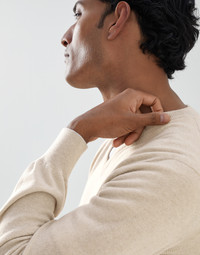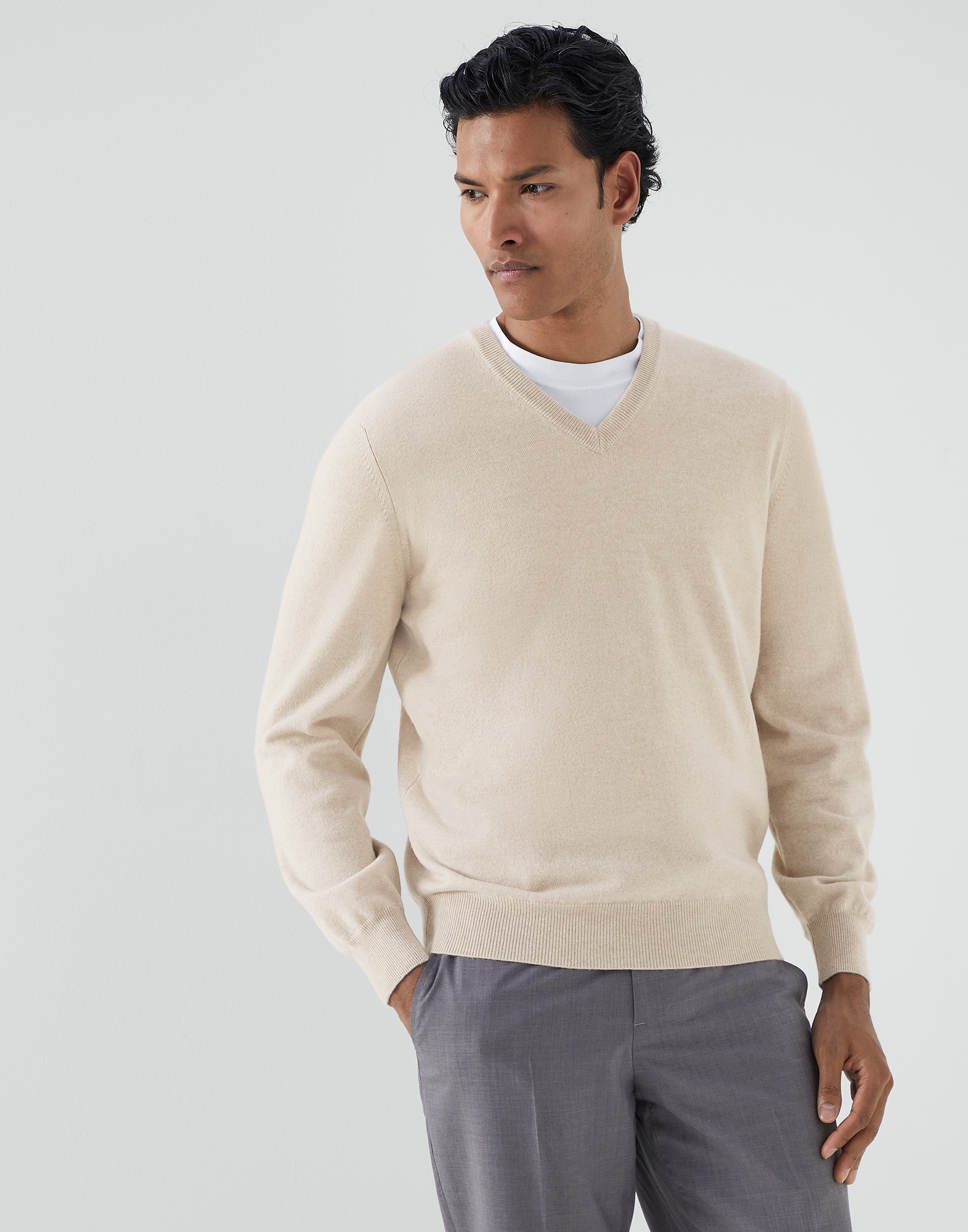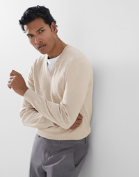Precious cashmere fiber enhances the long sleeve sweater, a four-season men's wardrobe piece. A narrow, contrasting color trim on the cuff and collar edges adds a refined detail to the garment which offers a regular, close-fitting shape. MATERIALS The noble cashmere fiber is characterized by an extreme fineness and also for its precious insulating qualities which guarantee warmth, providing coverage and lightness when worn. DETAILS Rib knit V-neck Rib knit cuffs and bottom band Plain stitch 100% CASHMERE