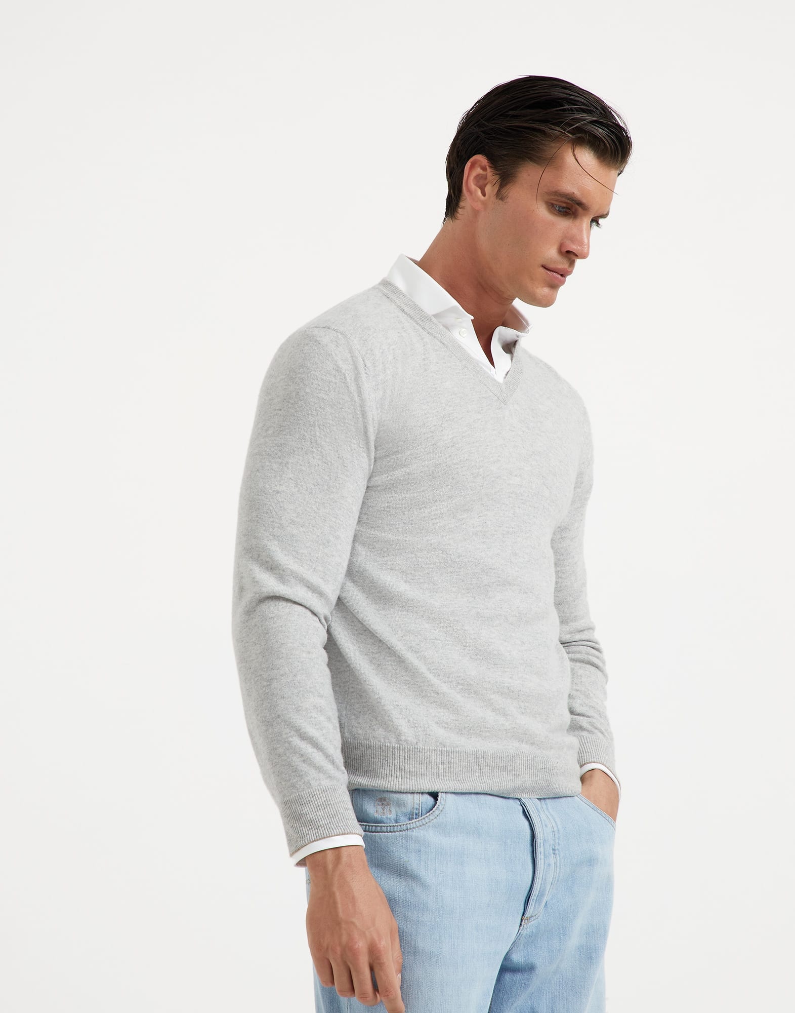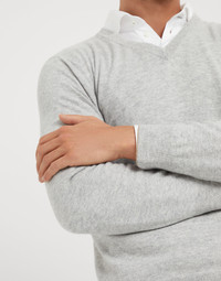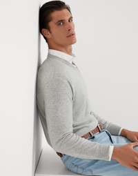 Precious cashmere fiber enhances the long sleeve sweater, a four-season men's wardrobe piece. A narrow, contrasting color trim on the cuff and collar edges adds a refined detail to the garment which offers a regular, close-fitting shape. MATERIALS The noble cashmere fiber is characterized by an extreme fineness and also for its precious insulating qualities which guarantee warmth, providing coverage and lightness when worn. DETAILS Rib knit V-neck Rib knit cuffs and bottom band Plain stitch 100% CASHMERE