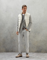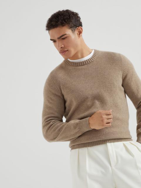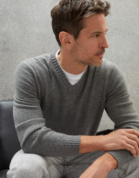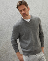 The iconic yarn of the Brunello Cucinelli collections enriches the essential, timeless look of this pure cashmere sweater. The rib knit edges of the V-neck, cuffs and bottom band give the garment a sporty touch. The fit offers regular proportions both in the chest and the sleeves. MATERIALS The noble cashmere fiber is characterized by an extreme fineness and also for its precious insulating qualities which guarantee warmth, providing coverage and lightness when worn. DETAILS Rib knit V-neck Rib knit cuffs and bottom band Plain stitch 100% CASHMERE