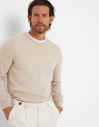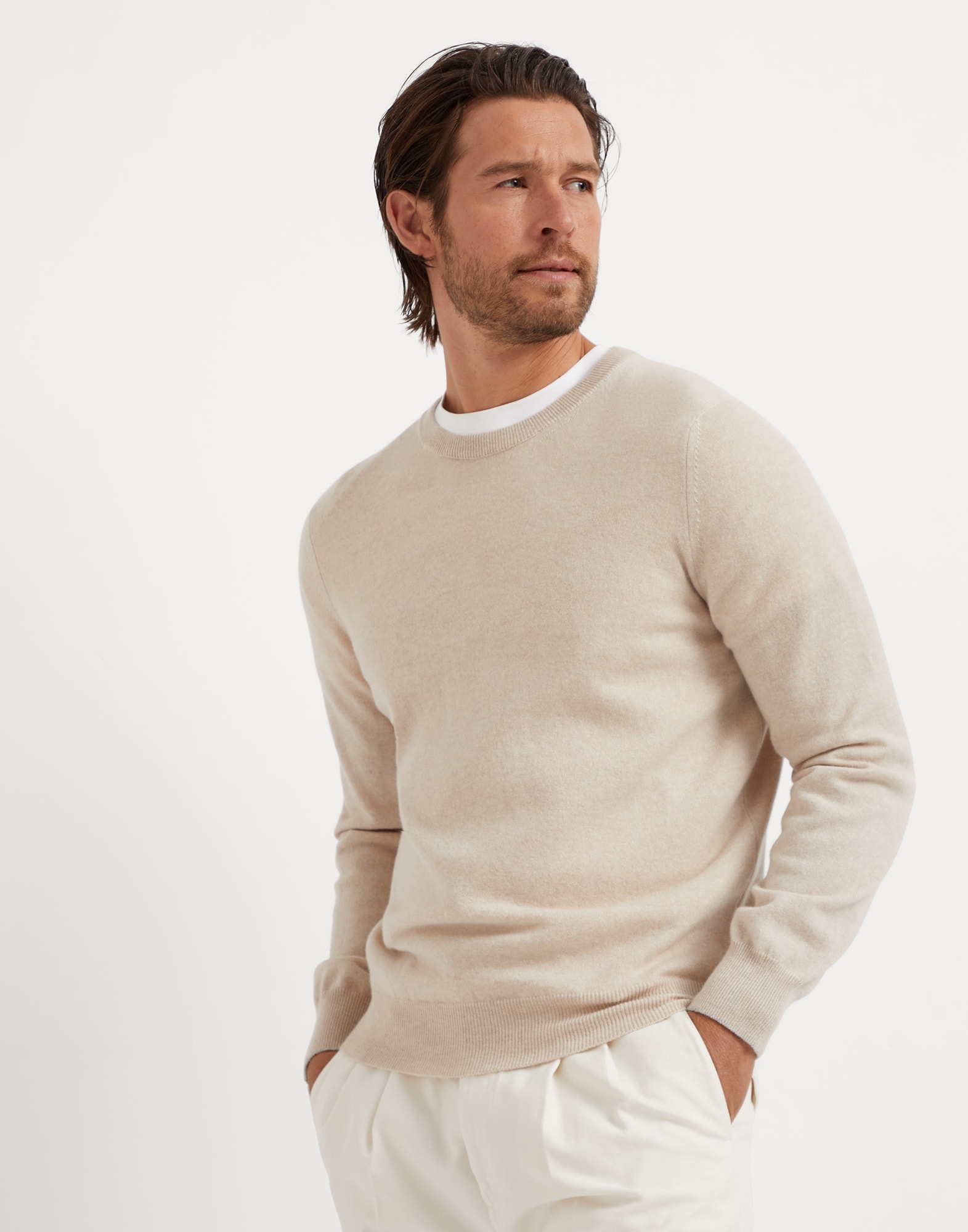 A timeless classic, this pure cashmere sweater represents an icon of the Brunello Cucinelli collections. The natural cashmere fiber’s superior quality enhances its comfortable fit, which is both lightweight and cozy. The contrast color edges of the cuffs and the inside of the crew-neck complete the style of this garment with refined details. MATERIALS The noble cashmere fiber is characterized by an extreme fineness and also for its precious insulating qualities which guarantee warmth, providing coverage and lightness when worn. DETAILS Crew-neck in rib knit Rib knit cuffs and bottom band Plain stitch 100% CASHMERE
