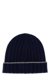 cod. M2240900CA058 Ribbed cashmere beanie with contrast piping and turn-up. Color: Blue Size & Fit: true to size fit Composition: 100% cashmere Made in: Italy