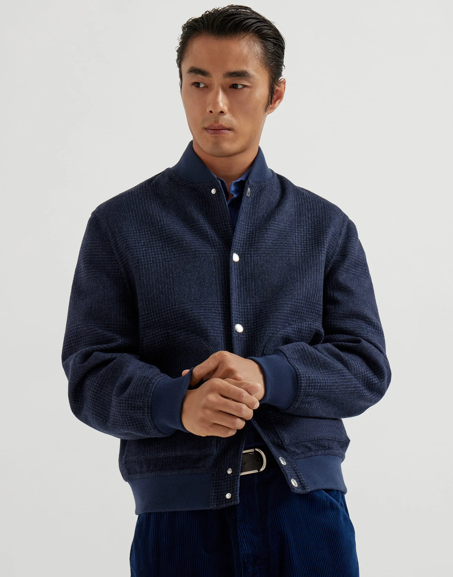 Turning from an iconic menswear staple into a sophisticated outerwear piece, the bomber jacket meets premium Brunello Cucinelli yarns and handcrafted techniques in this Prince-of-Wales cashmere version. The typical soft and airy texture of flannel enhances the colors of a classic pattern borrowed from the world of tailoring, subtly contrasting with a sporty silhouette complemented by the snap closure. The comfortable and lightweight fit is defined by the handcrafted double construction. MATERIALS In the exclusive double manufacturing technique, artisan know-how and modern assembly techniques blend together to create a superior quality garment with a clean look and no visible stitching. Cashmere flannel combines the fabric’s distinct soft appearance with the tailored Prince of Wales pattern to deliver a slightly retro appearance. DETAILS Snap closure Rib knit collar Rib knit cuffs and bottom band Patch hand pockets *Reversible side* Snap closure Patch hand pockets 100% CASHMERE