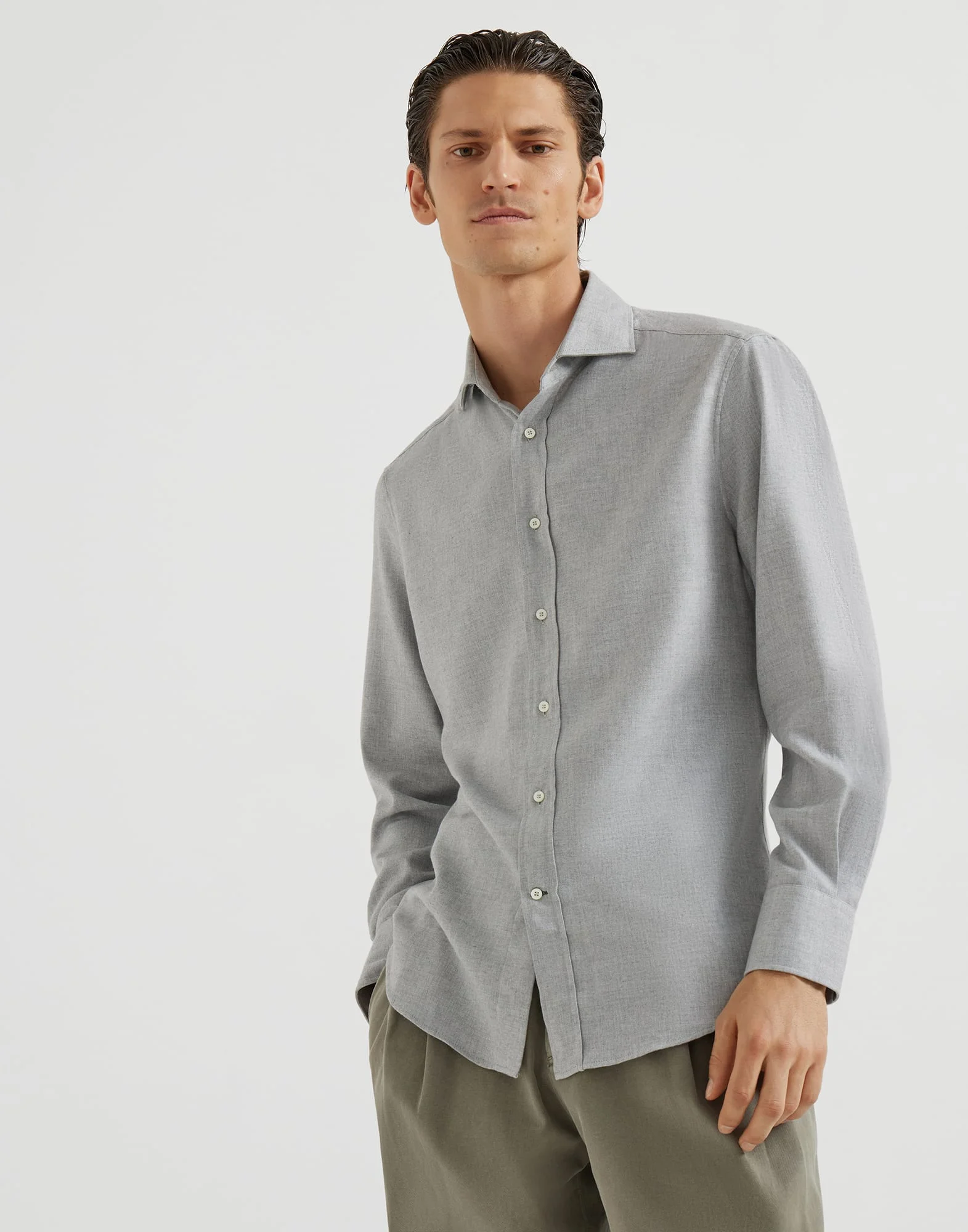 Skillful techniques and premium yarns enrich the casual and versatile lines of this stretch cotton shirt. The signature sartorial-inspired chevron texture blends together with the fabric's compact, supple feel, while the slim fit offers a streamlined silhouette through the chest and the shoulders. MATERIALS Precious natural fibers reproduce the classic chevron pattern with a modern and understated twist. The characteristics of flannel, soft and pleasant to the touch, ensure maximum comfort. The addition of synthetic fibers helps to create the perfect fit. DETAILS Placket closure with mother of pearl buttons Spread collar Cuffs have two mother of pearl buttons Slim fit 59% COTTON, 41% LYOCELL™