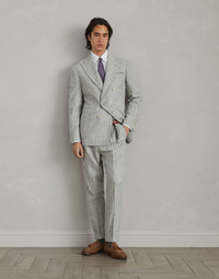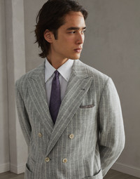 The timeless elegance of the pinstripe suit is combined with the excellence of the yarns and the informal attitude of the Leisure suit. The peak-lapel one-and-a-half-breasted jacket is complemented by double-pleated trousers, featuring a relaxed cut in the seat that naturally follows the body down the leg. The alpaca fibers create a distinctive gradient effect, which enhances the vintage feel. The “Solomeo Shoulder”, named after the hamlet where the company is located, characterizes the Brunello Cucinelli blazer with distinct proportions. The tapered and pronounced cut of the shoulder enhances the male physique without the need for padding. MATERIALS Long and voluminous alpaca fibers are paired with wool to reinterpret the classic pinstripe pattern with a refined retro-inspired shaded effect. The use of a minimal part of synthetic fibers contributes to fabric stability. The knee-length lining provides added comfort. DETAILS *Blazer* 3-roll-2 closure with horn buttons Peak lapel Patch pockets, ticket pocket and chest pocket Cuffs have four horn buttons and functional buttonholes Double back vent Two interior pockets with button closure and pen holder Drop 7 *Trousers* Zip closure with button, metal hook and backing button Pleat Slanted front pockets Back welt pockets Cuffed hem Lining to knee 56% ALPACA, 28% WOOL, 15% POLYESTER, 1% ELASTANE