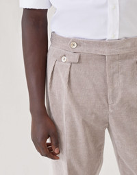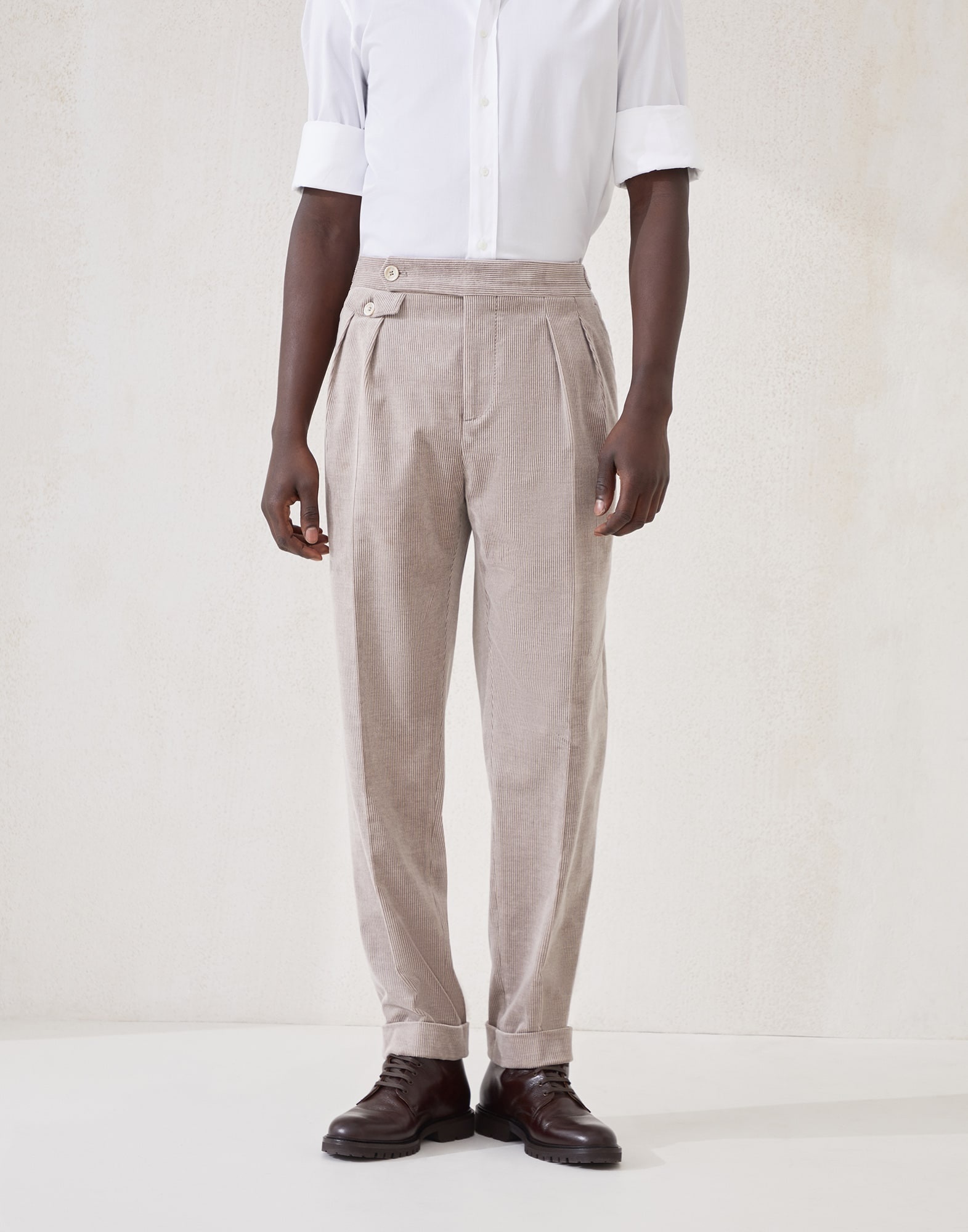 Classic inspirations and contemporary creativity define the refined feel of these traditional-fit trousers with double pleats and side tabs. The fabric’s unmistakable texture comes to life through the seasonal colors and the natural qualities of comfort cotton and cashmere fibers, for an ideal fit. The traditional fit is comfortable and remains close to the body along the leg to accentuate the male physique. MATERIALS Refined cashmere fibers enhance the traditional texture of cotton corduroy, accentuating its softness, warmth and sheen. The presence of an elastic fiber ensures maximum comfort. The knee-length inner lining enriches and complements the garment. DETAILS Zip closure with button, metal hook and backing button Slanted front pockets with watch pocket Double pleat Buckles on the side Back welt pockets with button Cuffed hem Lining to knee 91% COTTON, 8% CASHMERE, 1% ELASTANE