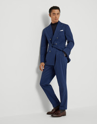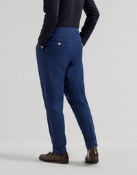 The measured elegance of details is paired with the excellence of yarns and defines the look of these tailor fit trousers in comfort cotton and cashmere gabardine. The fabric’s unmistakable diagonal weave runs throughout the retro-inspired silhouette with double pleats and waist tabs. The slightly high-waisted fit is very comfortable in the seat and develops rather straight down the leg. MATERIALS The cotton and cashmere gabardine is a refined fabric, characterized by a soft hand and a classic diagonal structure, enhanced by a small percentage of synthetic fiber to ensure an impeccable fit. DETAILS Zip closure with button, metal hook and backing button Slanted front pockets with watch pocket Double pleat Buckles on the side Back welt pockets with button Cuffed hem Lining to knee 95% COTTON, 4% CASHMERE, 1% ELASTANE