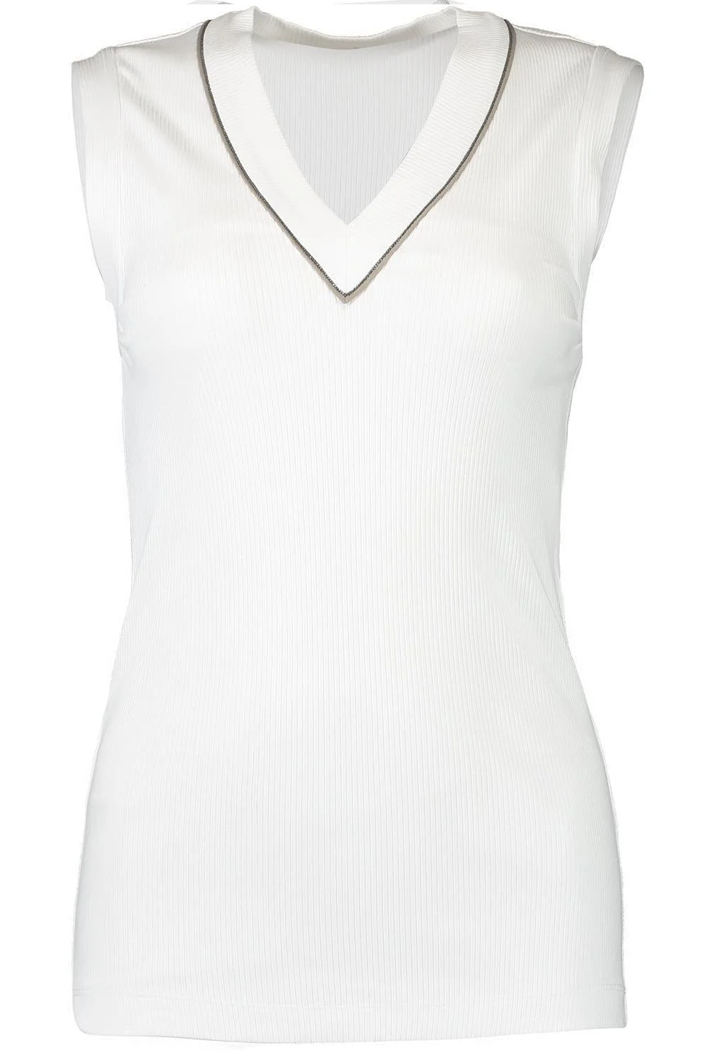 DETAILS AND INSIGHT Brunello Cucinelli comfort ribbed top in off white. 95% Cotton, Elastane Machine Wash Cold Made in Italy Style MG902FP312-COW29