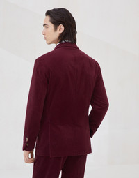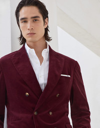 Classic inspiration and contemporary creativity define the refined feel of this one-and-a-half-breasted deconstructed blazer, completed by peak lapels and patch pockets. The fabric’s unmistakable texture comes to life through intense colors and the natural qualities of comfort cotton and cashmere fibers, for an ideal fit. The “Solomeo Shoulder”, named after the hamlet where the company is located, characterizes the Brunello Cucinelli blazer with signature proportions. The tapered and pronounced cut of the shoulder enhances the male physique without the need for padding. MATERIALS Refined cashmere fibers enhance the traditional texture of cotton corduroy, accentuating its softness, warmth and sheen. The presence of an elastic fiber ensures maximum comfort. The lightweight cupro lining enriches and completes the garment. DETAILS 6 horn button closure Peak lapel Welt pockets with flap, ticket pocket and chest pocket Cuffs have four horn buttons and functional buttonholes Cupro half lining Two interior pockets with button closure and pen holder Double back vent Drop 7 91% COTTON, 8% CASHMERE, 1% ELASTANE
