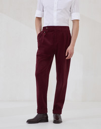 Classic inspirations and contemporary creativity define the refined feel of these traditional-fit trousers with double pleats and side tabs. The fabric’s unmistakable texture comes to life through the seasonal colors and the natural qualities of comfort cotton and cashmere fibers, for an ideal fit. The traditional fit is comfortable and remains close to the body along the leg to accentuate the male physique. MATERIALS Refined cashmere fibers enhance the traditional texture of cotton corduroy, accentuating its softness, warmth and sheen. The presence of an elastic fiber ensures maximum comfort. The knee-length inner lining enriches and complements the garment. DETAILS Zip closure with button, metal hook and backing button Slanted front pockets with watch pocket Double pleat Buckles on the side Back welt pockets with button Cuffed hem Lining to knee 91% COTTON, 8% CASHMERE, 1% ELASTANE