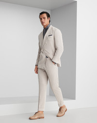 This one-and-a-half-breasted unconstructed jacket in cotton and silk chevron Solaro stands out for the distinct semi-glossy appearance created by the fabric’s precious texture. The “Solomeo Shoulder”, named after the hamlet where the company is located, characterizes the Brunello Cucinelli blazer with distinct proportions. The tapered and pronounced cut of the shoulder enhances the male physique without the need for padding. MATERIALS A classic tailored menswear fabric, the cotton Solaro combines threads dyed in two of the season’s colors to enrich the geometric texture with a slightly nuanced, iridescent effect. The presence of silk adds quality to the fabric, enhancing its fluidity and giving it a slight sheen. DETAILS Six button fastening Patch pockets, ticket pocket and chest pocket Cupro half lining Two interior pockets with button closure and pen holder Drop 7 Double back vent Buttons at cuffs 85% COTTON, 15% SILK