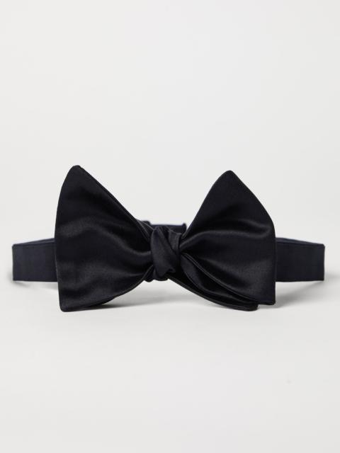 An essential accessory for evening events, the cotton and silk satin bow tie completes tuxedos with classic flair. This accessory, which must be tied, is adjustable thanks to a convenient hook-and-loop closure behind the neck. MATERIALS The cotton and silk satin employs the same fabric that decorates the tuxedo lapels, with a smooth texture and slightly shiny effect. DETAILS Hook closure 50% COTTON, 50% SILK