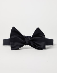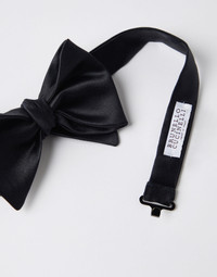 An essential accessory for evening events, the cotton and silk satin bow tie completes tuxedos with classic flair. This accessory, which must be tied, is adjustable thanks to a convenient hook-and-loop closure behind the neck. MATERIALS The cotton and silk satin employs the same fabric that decorates the tuxedo lapels, with a smooth texture and slightly shiny effect. DETAILS Hook closure 50% COTTON, 50% SILK