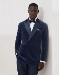 The elegance of an impeccably tailored construction highlights the sophisticated allure of this velvet tuxedo jacket, completed by classic peak lapels in glossy satin. The natural properties of the cotton and silk fibers give the fabric a fluid hand and enhance the season’s intense colors. The one-and-a-half-breasted jacket’s construction highlights the male physique, featuring close fitting lines through the chest with slightly pronounced shoulders. MATERIALS The blend of cotton and silk fibers gives the velvet a soft, luminous texture that delicately enhances the season’s distinctive colors. The lightweight cupro lining completes the garment for absolute comfort. DETAILS Six button fastening Peak lapel Welt pockets and chest pocket Buttons at cuffs Cupro lining Two interior pockets with button closure and pen holder Drop 7 62% COTTON, 38% SILK