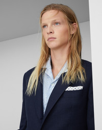 The refined feel of the cotton and virgin wool diagonal twill fabric enhances the timeless style of this suit. The fit of the blazer follows the proportions that distinguish Brunello Cucinelli style: close-fitting through the chest with slightly pronounced shoulders to highlight the male physique. The leisure-fit pleated trousers feature soft proportions in the seat and a slight low-rise, while the cut of the leg remains close to the body. MATERIALS Extremely nice to the touch, the combination of refined cotton and virgin wool fibers gives the fabric a fresh, fluid appearance, enriching the texture with sophisticated color nuances. DETAILS *Blazer* 3-roll-2 closure with horn buttons Welt pockets with flap, ticket pocket and chest pocket Cuffs have four horn buttons and functional buttonholes Cupro half lining Two interior pockets with button closure and pen holder Double back vent *Trousers* Zip closure with button and backing button Slanted front pockets Back welt pockets 19 cm hem Lining to knee Pleat Leisure fit: the rise and seat are soft and the proportions of the leg are tapered 52% COTTON, 48% VIRGIN WOOL